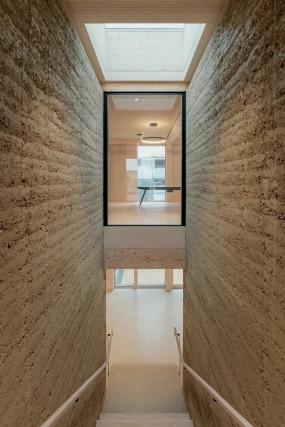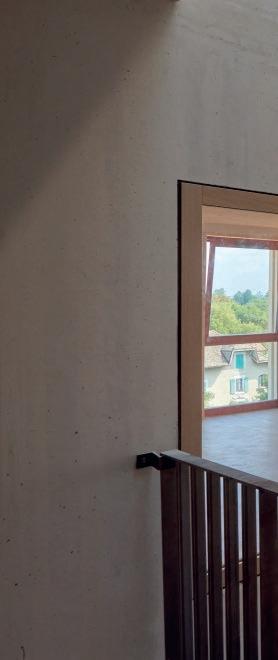 Cette exigence écologique se reflète également dans les matériaux utilisés. Au rez-dechaussée, un sol à faible retrait, fabriqué à partir de matériaux de démolition recyclés, a été mis en œuvre. Poncé et vitrifié, il allie qualité esthétique et réemploi. Les cages d’escalier et les salles d’eau sont construites en pisé, issu des déblais de l’excavation. Un matériau traditionnel qui répond à des préoccupations contemporaines puisqu’il a permis de réduire considérablement les distances de transport. De plus, l’argile brute, sans crépi, contribue à la caractérisation du bâtiment tout en régulant son climat intérieur.