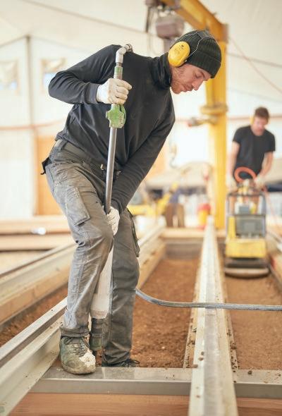 2 Un projet pionnier à tous points de vue: les plancher en bois et en argile intégrée à la structure caractérisent l’immeuble de bureaux ‹Hortus› à Allschwil, ici durant la mise en œuvre et après la pose. Architecte Herzog & de Meuron, Bâle Maître d’ouvrage Senn Resources AG, Saint-Gall Photo David Walter (chantier) und Maris Mezulis (intérieur)