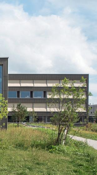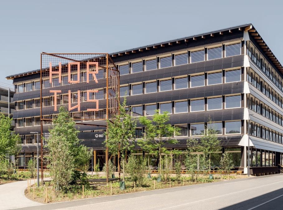 Dans la commune bâloise d’Allschwil, le campus Switzerland Innovation Park attire des acteurs internationaux du secteur des sciences de la vie. C’est dans ce contexte dynamique que le bâtiment Hortus propose 600 postes de travail pour une nouvelle génération d’entreprises, désireuses d’offrir à leurs collaborateurs un cadre de travail moderne et flexible. De l’extérieur, le bâtiment semble flotter audessus du sol. La dalle du rez-de-chaussée est légèrement surélevée, soutenue par des pilotis qui permettent de libérer le sol sous le volume du bâtiment. Un passage sur la façade sud