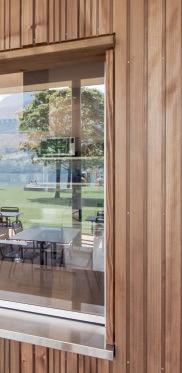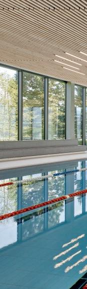 2 Ein Panoramafenster fasst für die Schwimmenden in der neuen Halle auf der ganzen Länge die angrenzende Umgebung zu einem Bild. Damit schafft das Projekt eine überzeugende Verbindung zwischen Innen- und Aussenbereich. Gleichzeitig prägt die beidseitig ansteigende Holzdecke den Raumeindruck. Foto Charles Bouchaïb