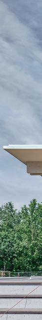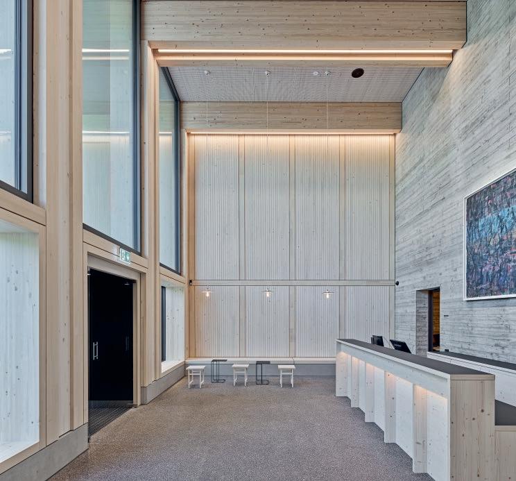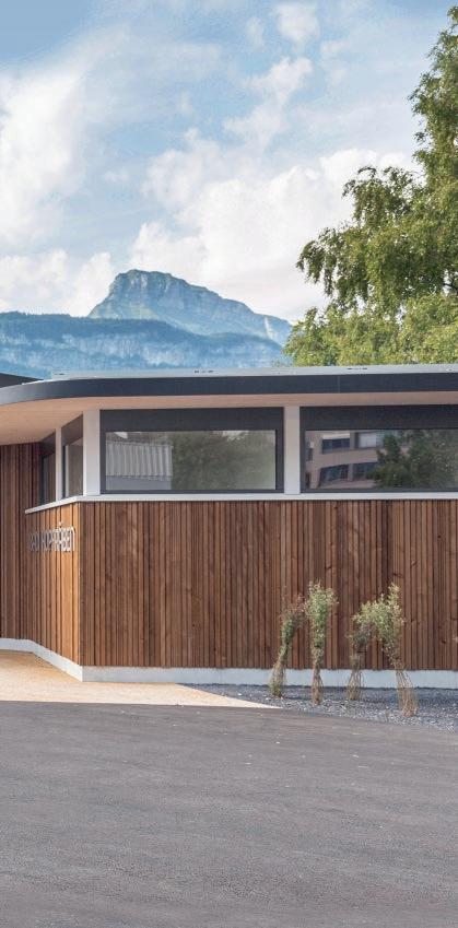 extensiv begrünt. Die Timber-Structures-3.0Technologie verklebt Holzbauteile aus Brettschichtholz stirnseitig. Dadurch lassen sich punktgestützte, mehrachsig tragende Platten erstellen, wie sie für das Dach über dem Eingangsbereich und dem Restaurant verwendet wurden. Die teilweise schräge Anordnung der Stützen dient der Aussteifung. Gegen aussen unterscheiden sich die Wände des beheizten und unbeheizten Gebäudes nicht wesentlich. Die Wände sind vertikal dreifach gegliedert: in einen Sockel aus Betonelementen oder Faserzementplatten, in die Holzfassade sowie die Fensterbänder. Die ausladenden Vordächer sorgen für den konstruktiven Wetterschutz. Mit einer Verschalung aus drei verschiedenen Täfertypen erzeugt die profilierte Holzfassade ein Bild, welches das Licht der Umgebung unterschiedlich reflektiert und so die langen Fassadenbänder belebt. Diese Wahrnehmung verstärkt die Rhythmisierung der Fenster- und Stützeneinteilung. Die hohe Lage der Fensterbänder, die im beheizten Gebäude den obersten Wandabschnitt bilden, schafft ein angenehmes, indirektes Arbeitslicht, während die Vordächer vor direkter Sonneneinstrahlung schützen. Im ungedämmten