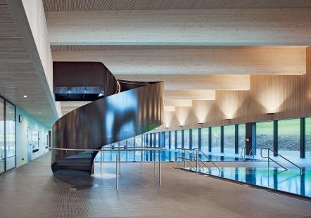 als Teil der Schwimmhalle über die gesamte Länge offen angeordnet und leitet die Besucher zu einer grosszügigen Wendeltreppe und zu den verschiedenen Becken im Erdgeschoss. Auch der Wellnessbereich mit Sauna, Kneippbecken und Erlebnisduschen liegt im Obergeschoss und ist über die Galerie erschlossen. Zwei hindernisfreie Umkleidekabinen mit Dusche und separatem WC im Erdgeschoss ermöglichen einen direkten Zugang zur Schwimmhalle. Die räumliche Verbindung der Schwimmhalle zum Aussenraum wird strukturell betont. In südlicher Richtung begrenzt ein grosser, auf drei Stützen liegender Holzfachträger den Hallenraum, so dass der Blick auf das Grün der ansteigenden Liegewiese gelenkt und das Fliessen des Raumes in Längsrichtung betont wird.