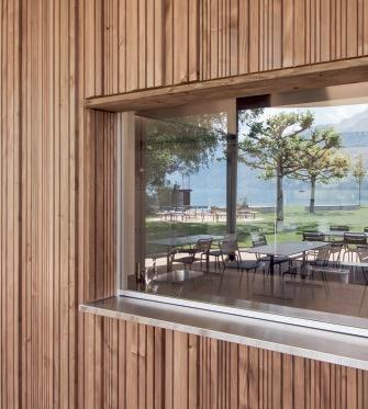 führt auf dieser Höhe rund um das Gebäude. So lässt sich für die mit Vorvergrauungslasur behandelte Holzkonstruktion ein guter Feuchteschutz erreichen. Das Holztragwerk ist eine einachsig gespannte Decke aus Zwillingsträgern, die auf Paarstützen mit vergleichbaren Abmessungen ruhen. Aussen, durch das Flachdach vor Witterung gut geschützt, werden diese zum prägenden Element der Fassade. Träger und Stützen wurden als Elemente im Werk hergestellt und auf der Baustelle auf statisch einfache Weise unsichtbar zu einem Rahmen zusammengesetzt. Die oben liegenden, 10 cm starken Holzplatten hat man entlang der Längsfugen biege- und schubfest zu einer Deckenscheibe verbunden. Rahmen und Deckenscheibe sind an den massiven Betonkern angeschlossen und sorgen gemeinsam für ein stabiles Gebäude. Die grosszügig auskragenden Decken schützen nicht nur das Tragwerk vor der Witterung, sondern leisten auch einen wertvollen Beitrag zum sommerlichen Wärmeschutz. Mit den seitlichen, schottenartigen Wänden, die als fein gegliederte, kassettierte Flächen behandelt sind, wird formal ein Ortsbezug zu den traditionellen Kassettenverkleidungen geschaffen. Gleichzeitig entsteht so ein Wechselspiel von offen und geschlossen, das partiell bewusst gebrochen wird: So weckt eine Art Guckfenster zur Sitterstrasse hin Vorfreude auf das baldige Badevergnügen.