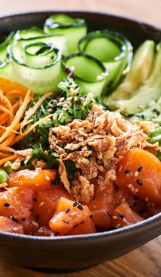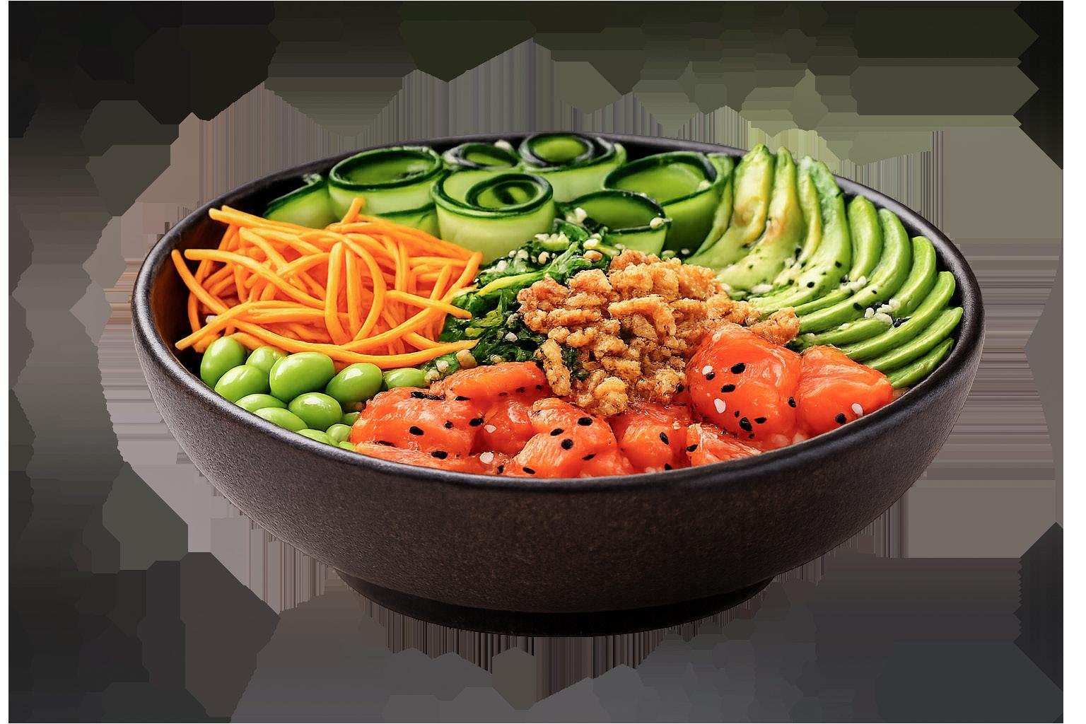 • Add salmon and arrange fresh toppings around the bowl.