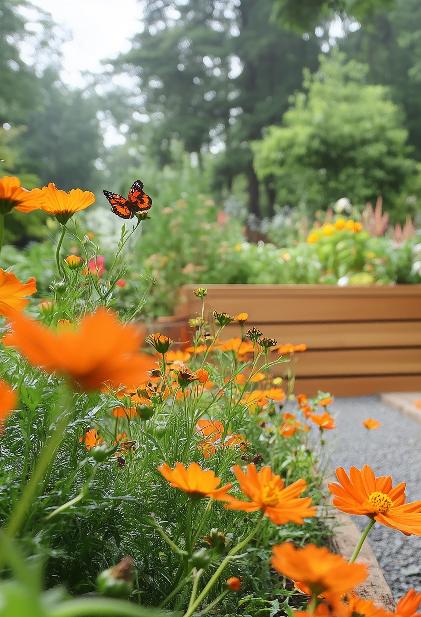 In raised beds, flowers are often planted along the edges or in the corners. This placement keeps pathways clear while making full use of available growing space.
