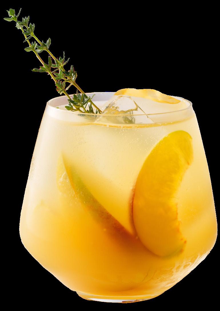 5. Garnish with a sprig of thyme and a thin peach slice on the rim. Serve chilled and enjoy the summer glow.
