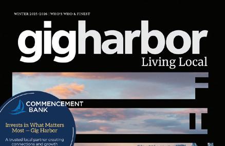 Gig Harbor Living Local’s Finest 2025 celebrates the businesses and individuals who continue to strengthen our harbor community. is year’s winners re ect commitment, consistency, and the connection that de nes Gig Harbor. Inside, our feature on Commencement Bank highlights their dedication to serving local clients with dependable guidance and a community-focused approach, o ering readers a closer look at the people behind their trusted nancial services.