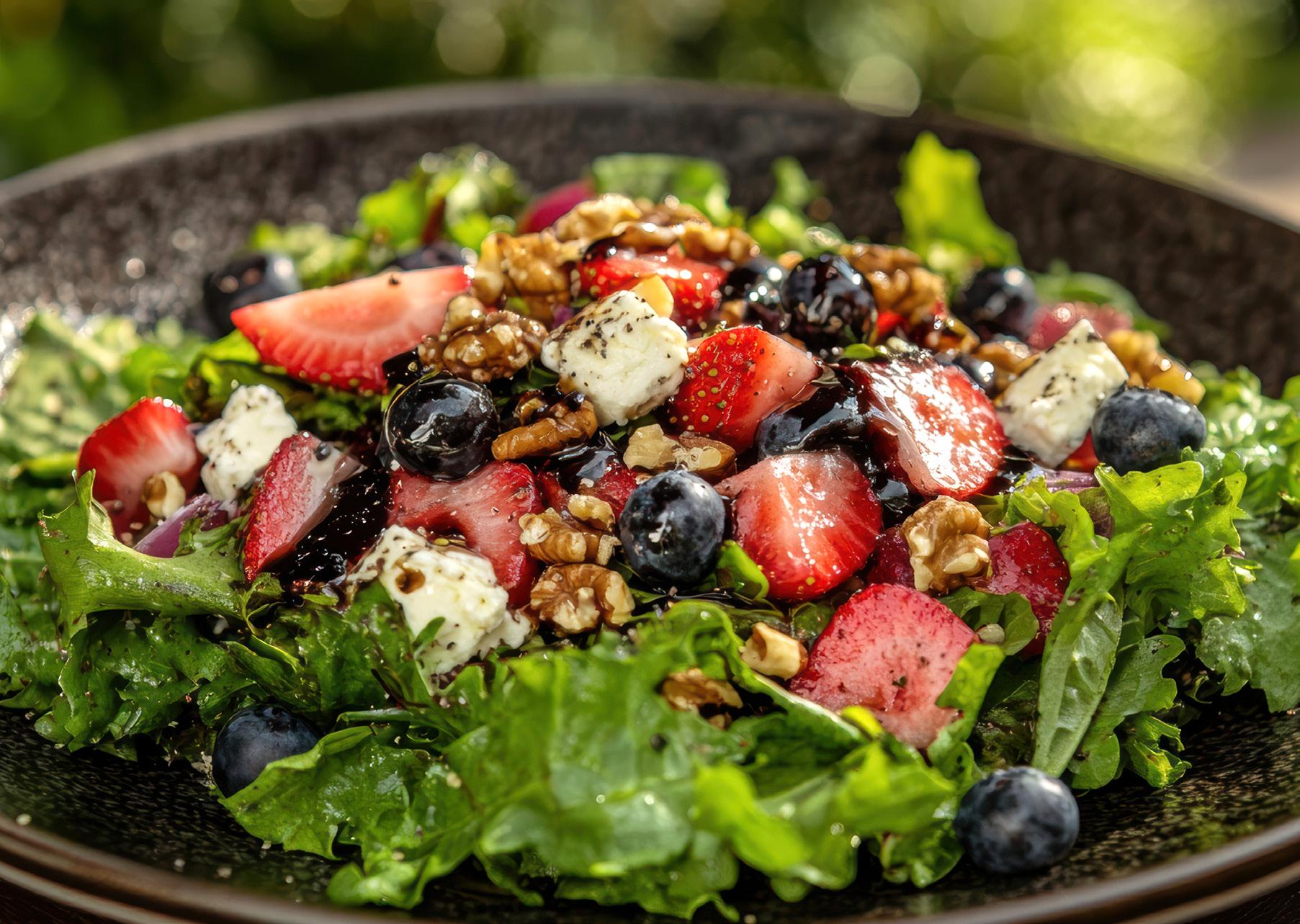 • In a large bowl, combine the mixed greens, strawberries, blueberries, raspberries, blackberries, red onion, and toasted nuts.