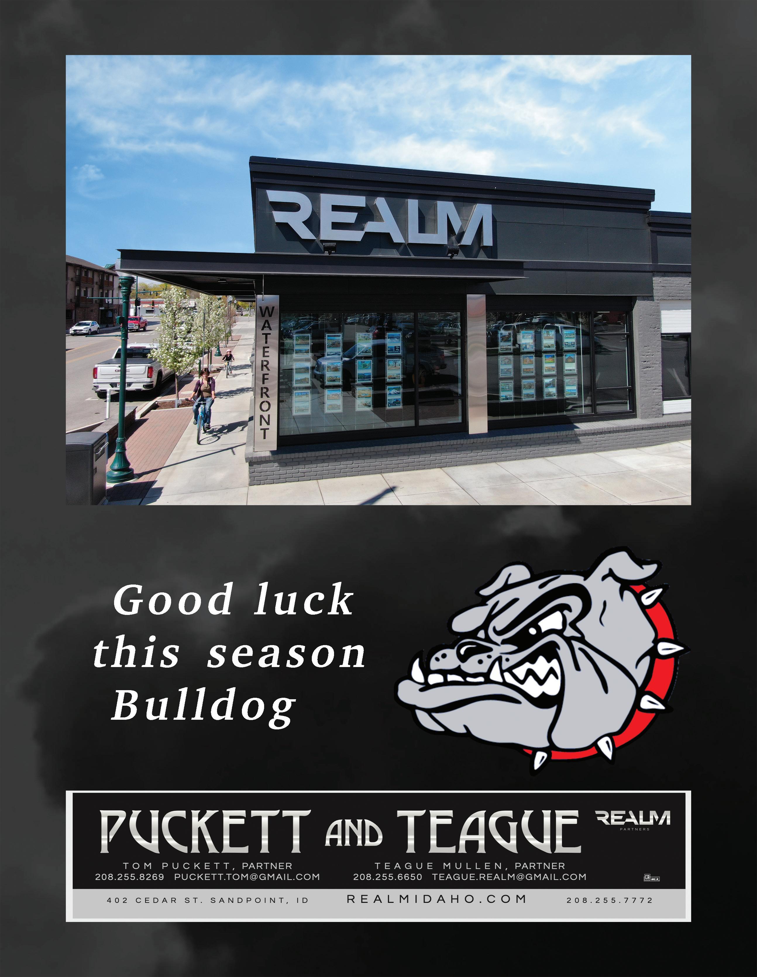 SHS FOOTBALL 2023 51 24-HOUR EMERGENCY RESPONSE FIRE | WIND | SMOKE | MOLD | WATER WE FIX IT. WHEN DISASTER STRIKES... 468211 Hwy. 95, Sagle, ID • NorthIdahoFloodAndFire.com • 208.290.6660 Proud Supporters of the Sandpoint $20 ROCK CHIP Grizzly Glass Centers offers more than 30 years of experience, with the best reputation, and provides only top quality services. Expert auto glass services with top-qualified and certified technicians on staff, we use only professional grade products and up to date equipment. We offer quality work at an affordable price, guaranteed! 208.255.2686 | 337 Olive Avenue in Sandpoint | grizzly-glass.com GO BULLDOGS!