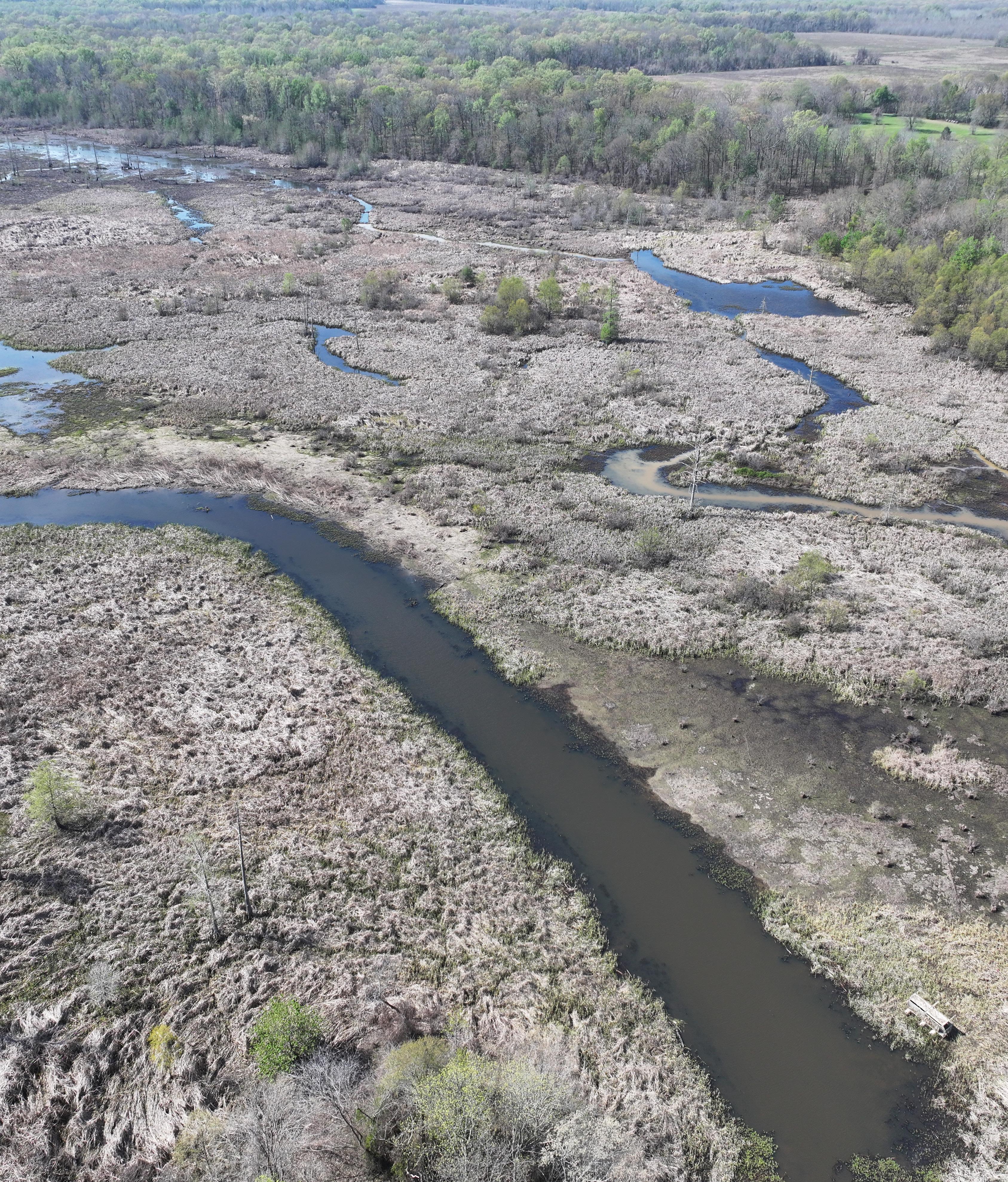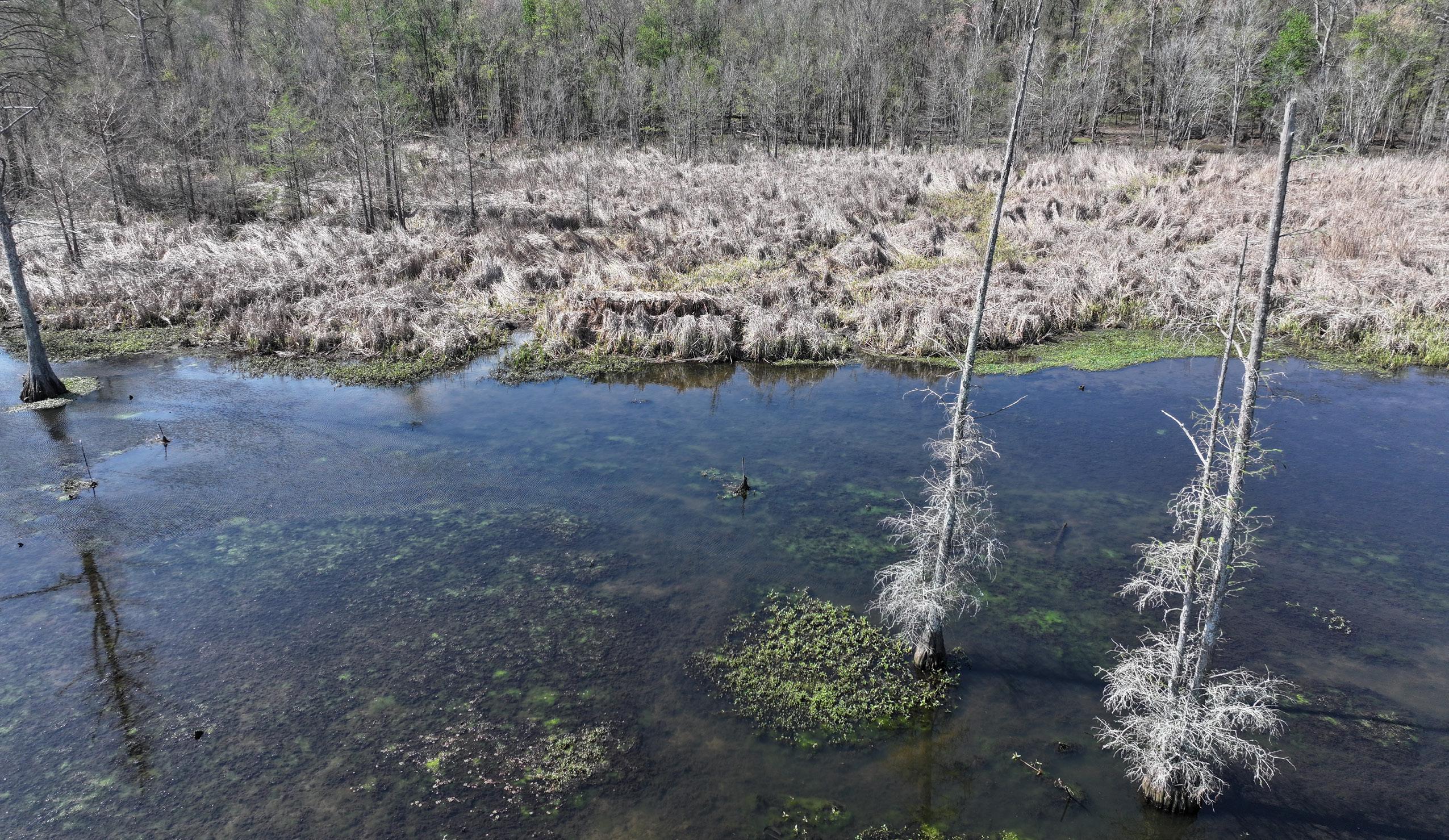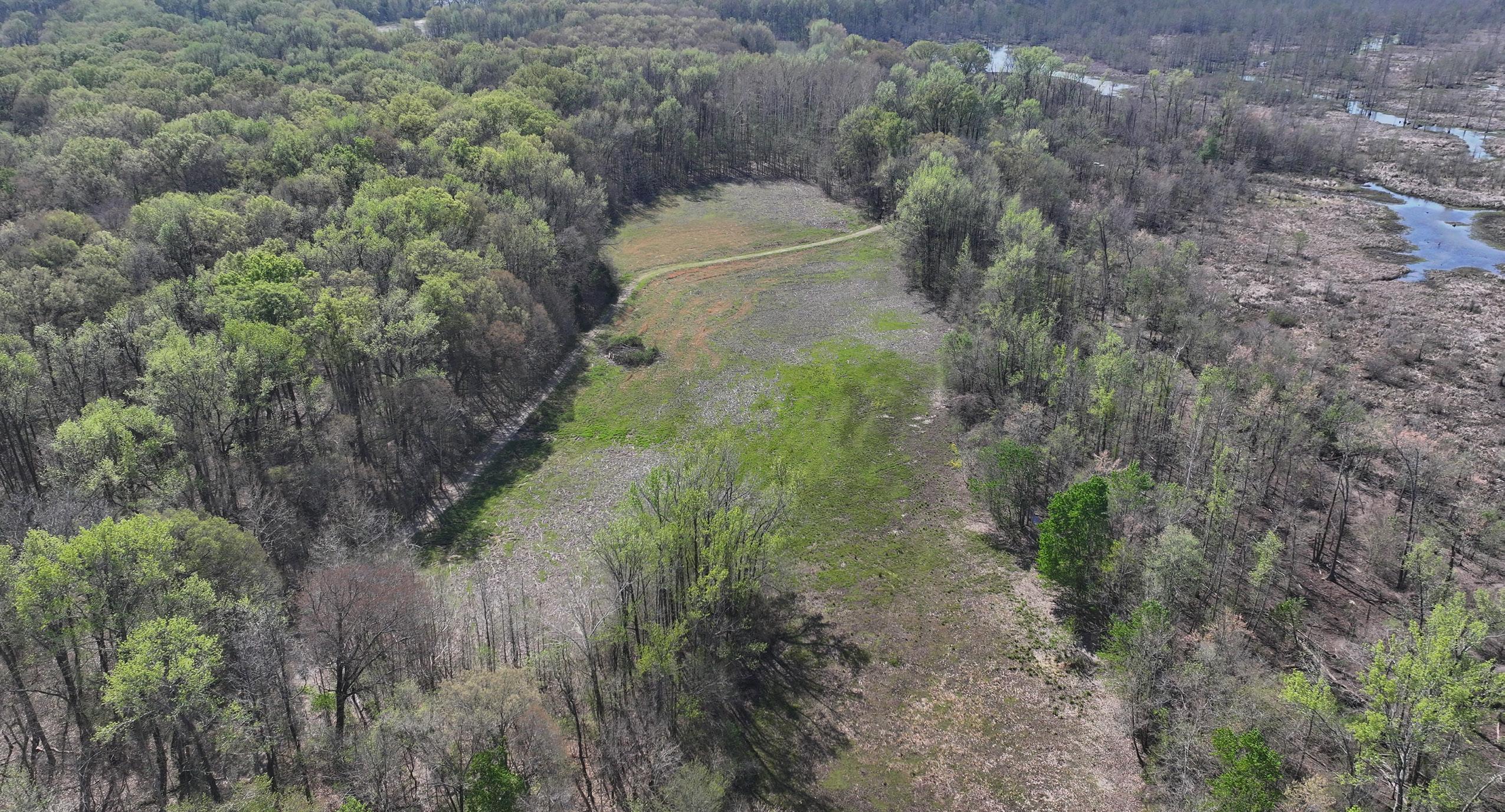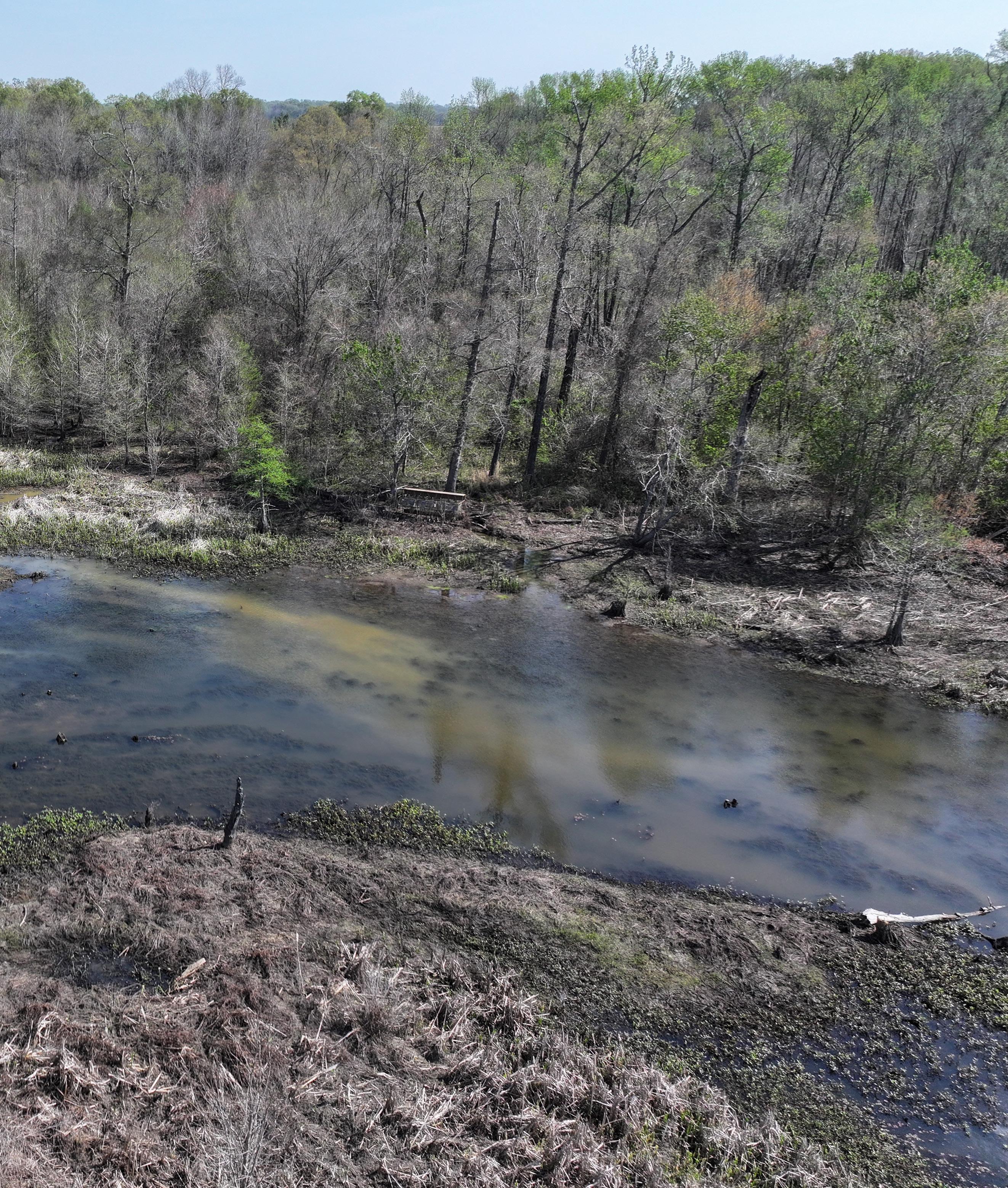 The south tract is well-appointed with an existing boathouse and a partially graveled parking lot, offering convenient access for boats and equipment during the season. From the boat shed, boat trails cut by a floating trackhoe lead directly to three established hunting holes, each equipped with blinds and ready for opening day. A boat trail extends northward through Big Creek, connecting the southern tract to additional established shooting holes on the 40-acre northern parcel.