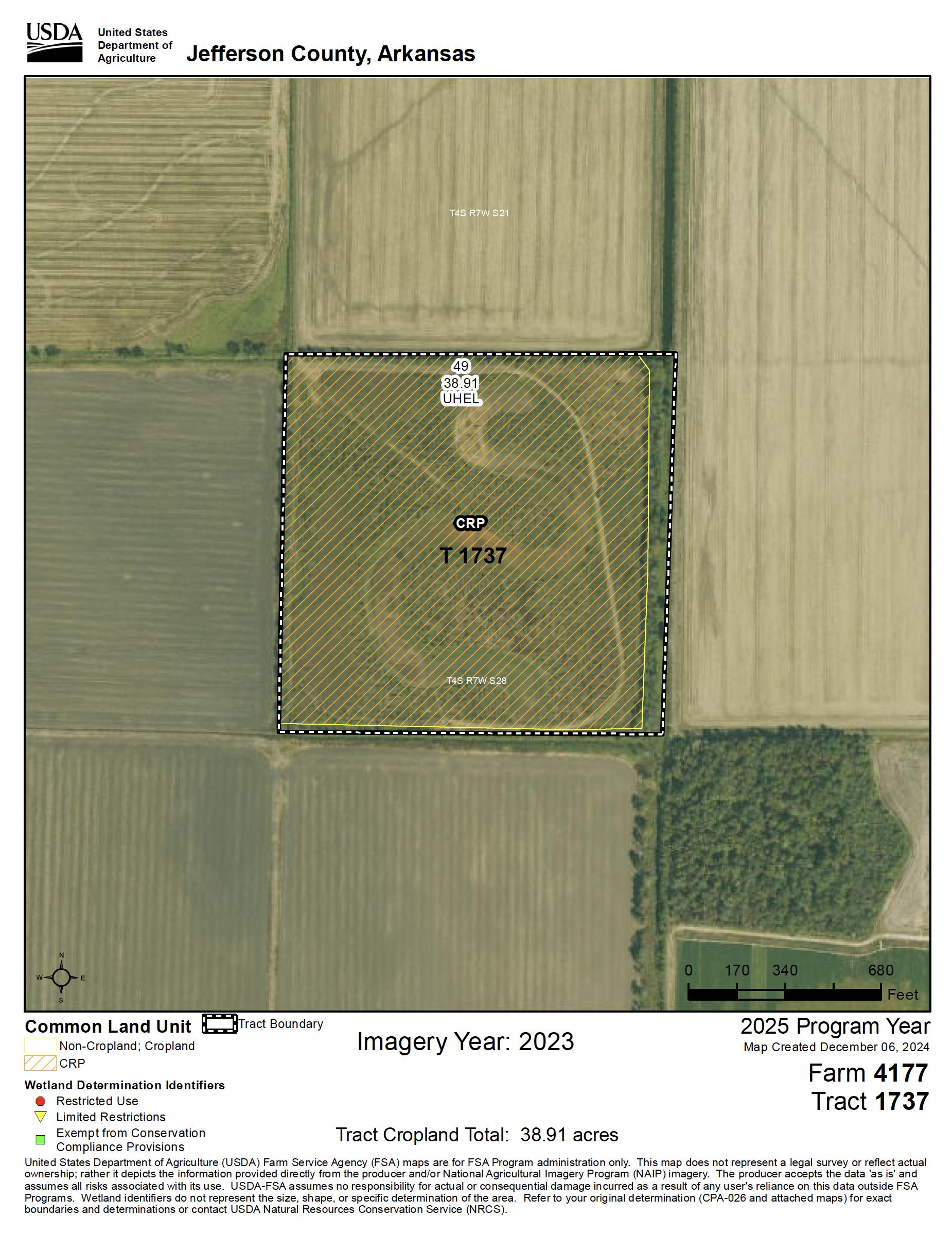 Of the total acreage, 38.91± acres are enrolled in the Conservation Reserve Program (CRP), providing annual income to the landowner while enhancing deer and duck hunting on the property. Approximately 7± acres have been designated as a moist soil unit managed for waterfowl food production, and the majority of the remaining acreage has been planted in red oaks to further improve duck and deer habitat.