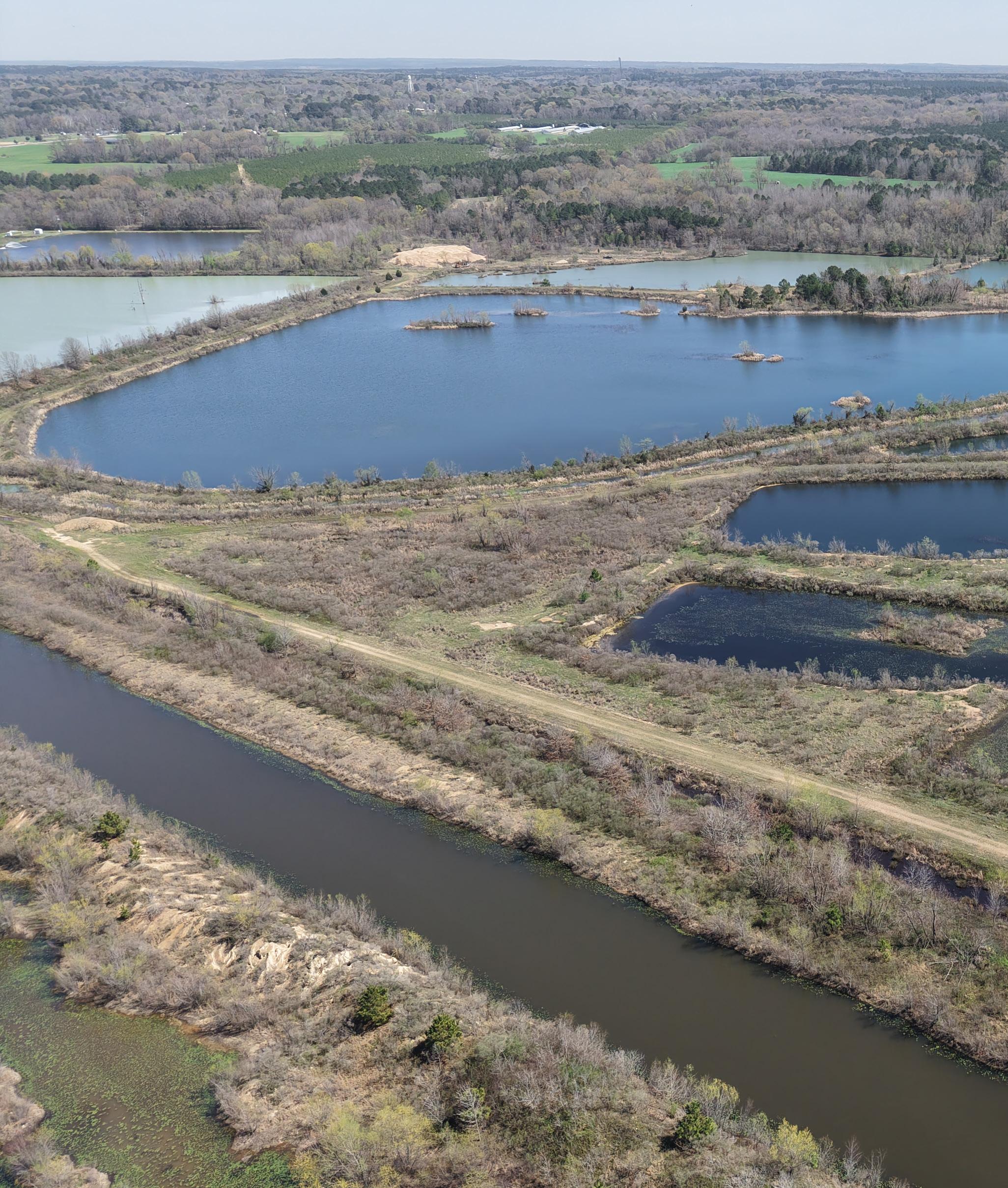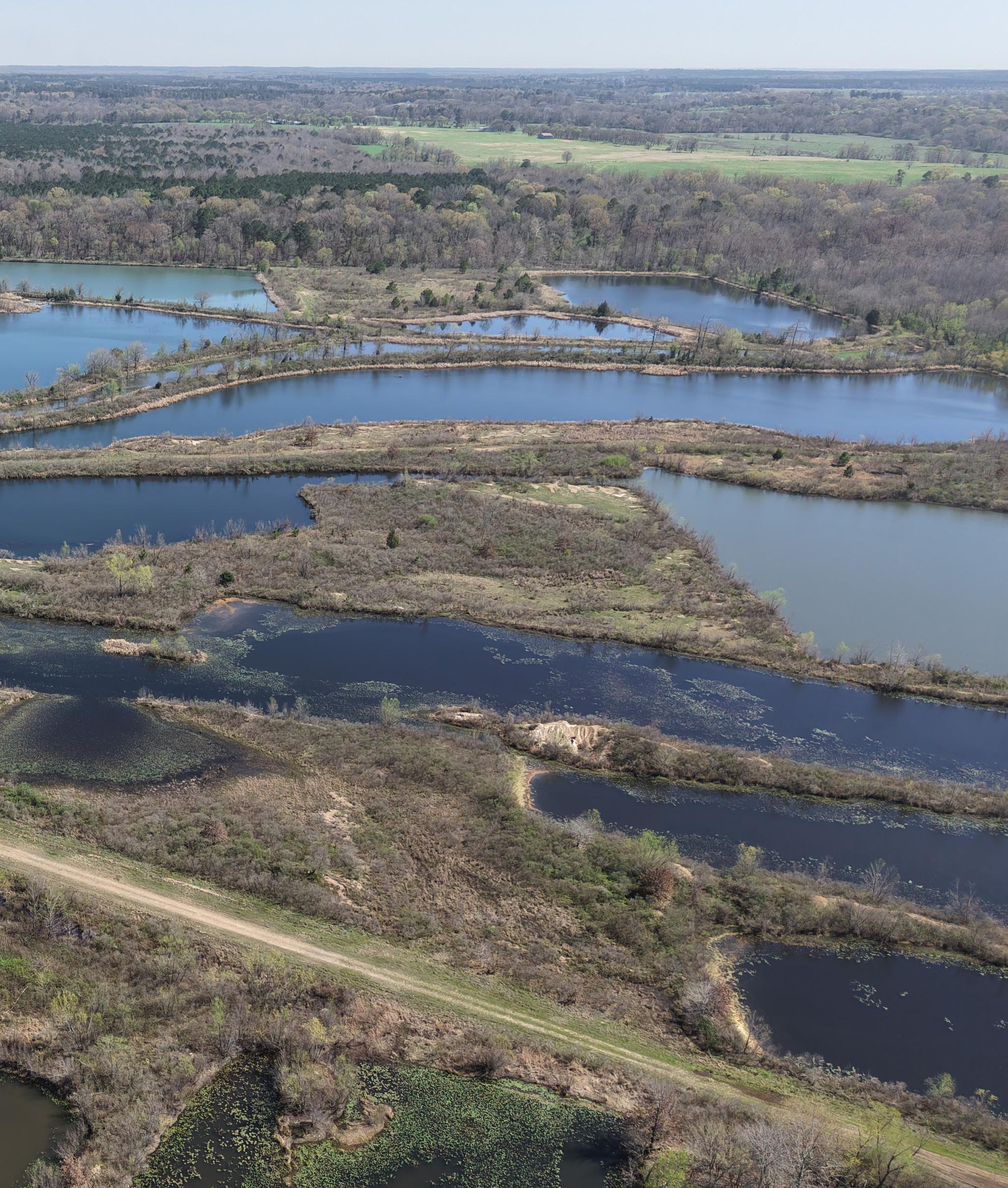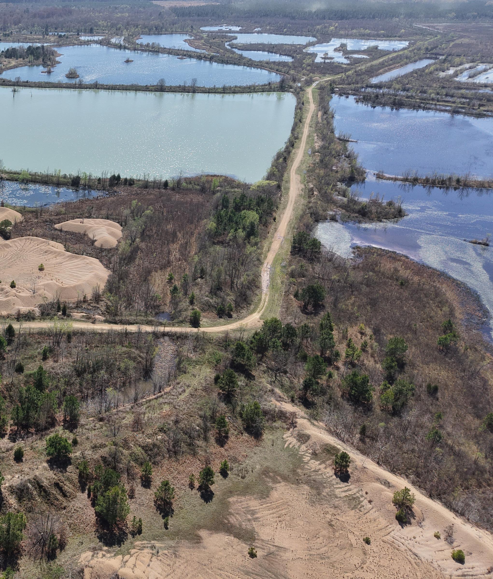 An interior road and levee system connects the ponds and provides excellent internal access. These ponds could easily be merged to create several larger bodies of water, and their varying depths and topography offer strong potential to further enhance fishing throughout the property.