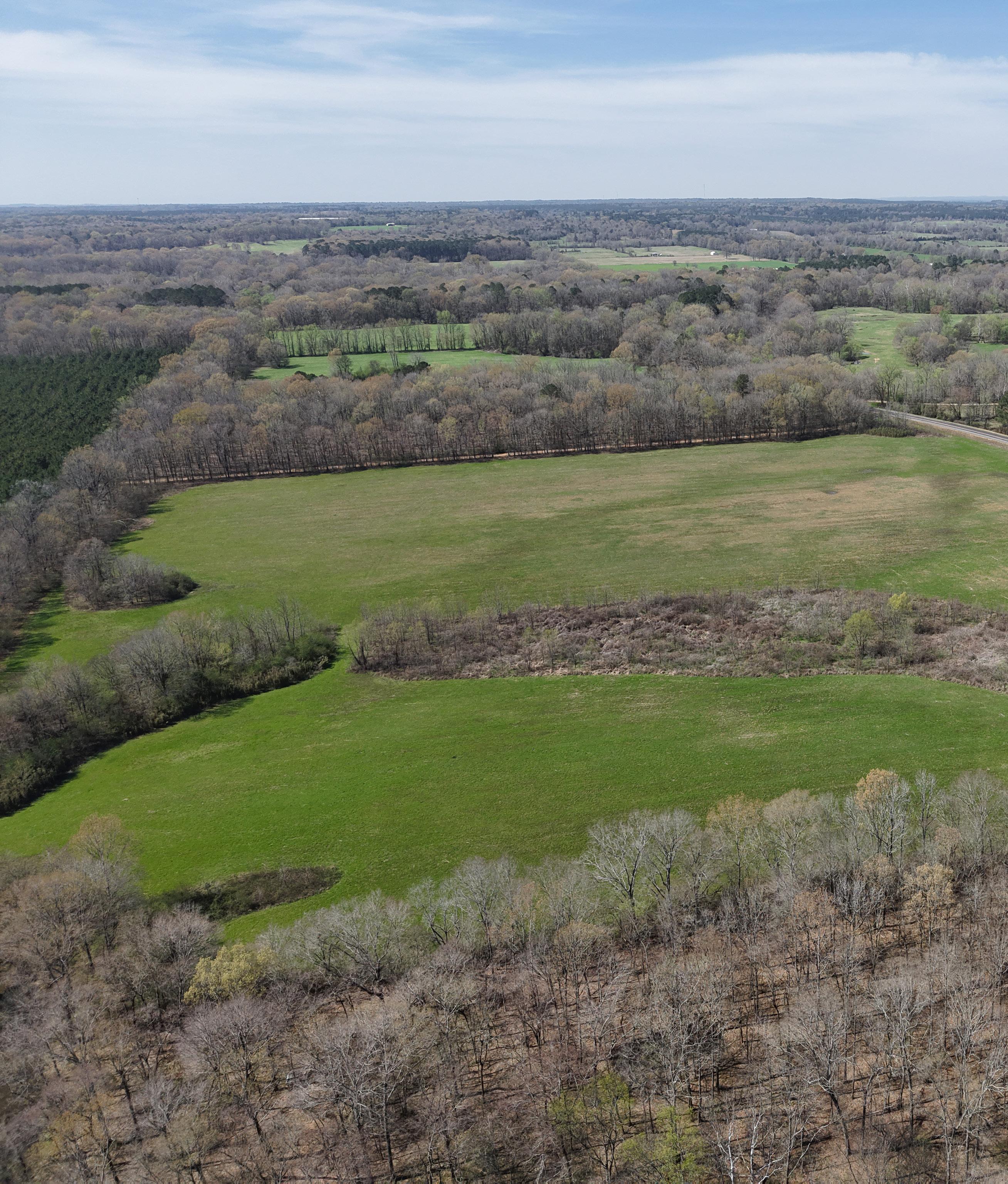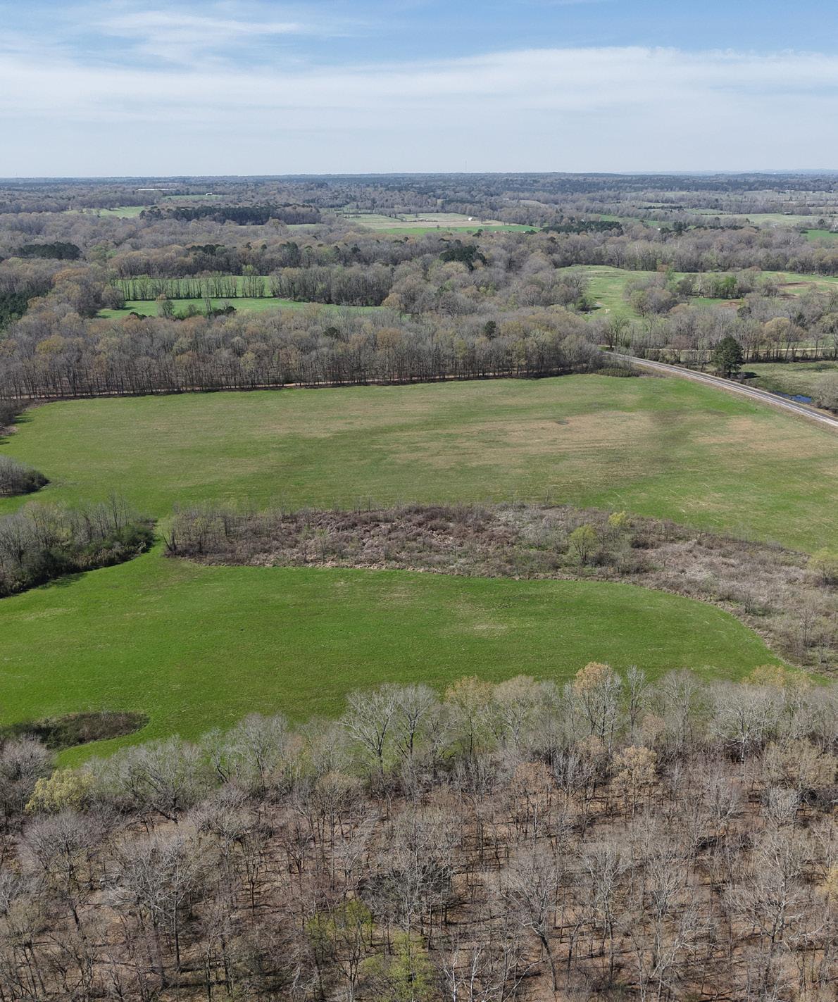 The northern portion of the property features a mix of pasture and wooded areas, providing quality habitat for deer, turkey, and small game hunting. A 7,352± square foot shop on the north side of the property offers ample storage for hunting and fishing equipment.