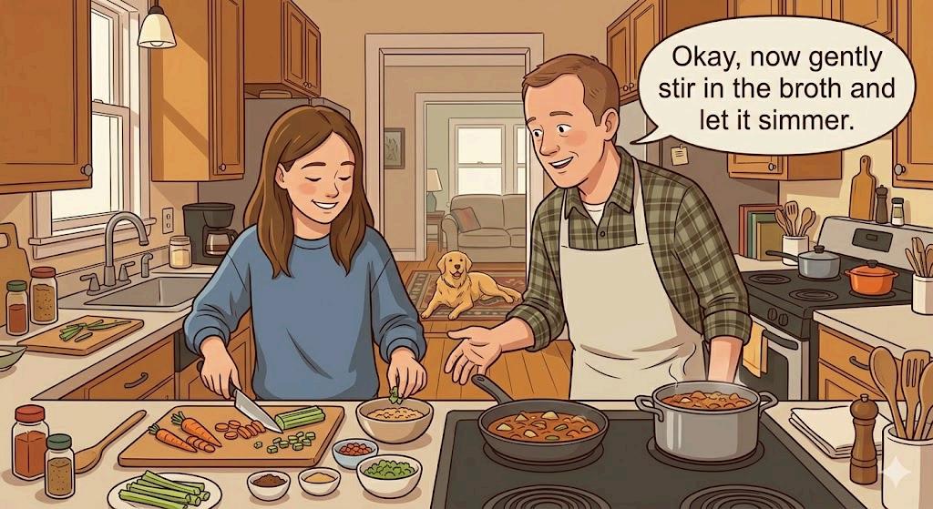 I nodded and started preparing the I nodded and started preparing the ingredients. I did most of the cooking ingredients. I did most of the cooking while my dad guided while my dad guided on what I should on what I should do next. do next.