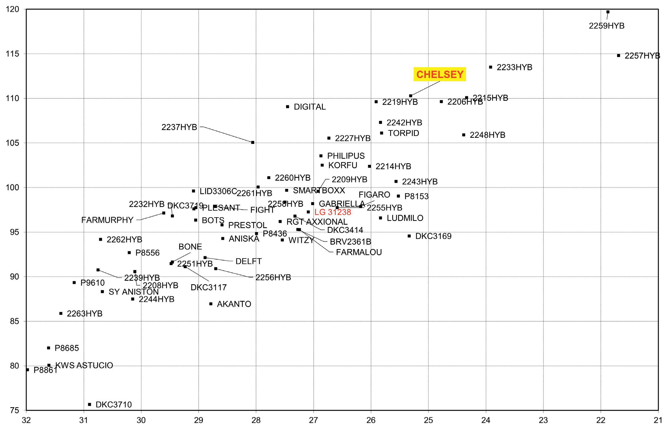 % HUMIDITÉ VS. RENDEMENT GRAIN À 15% HUMIDITÉ/HA (REL. PAR RAPPORT À 4 TÉMOINS)