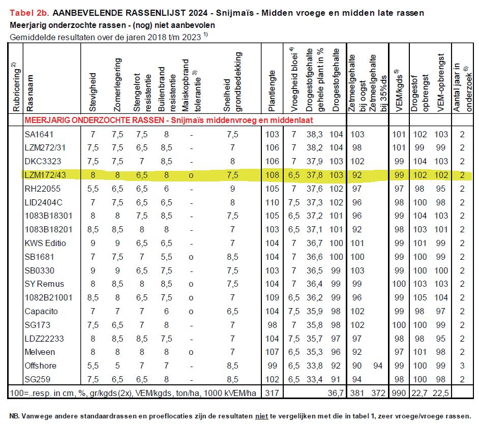LISTE RECOMMANDÉE PAYS-BAS 2024, MAÏS ENSILAGE, VARIÉTÉS DEMI-PRÉCOCES ET DEMI-TARDIVES