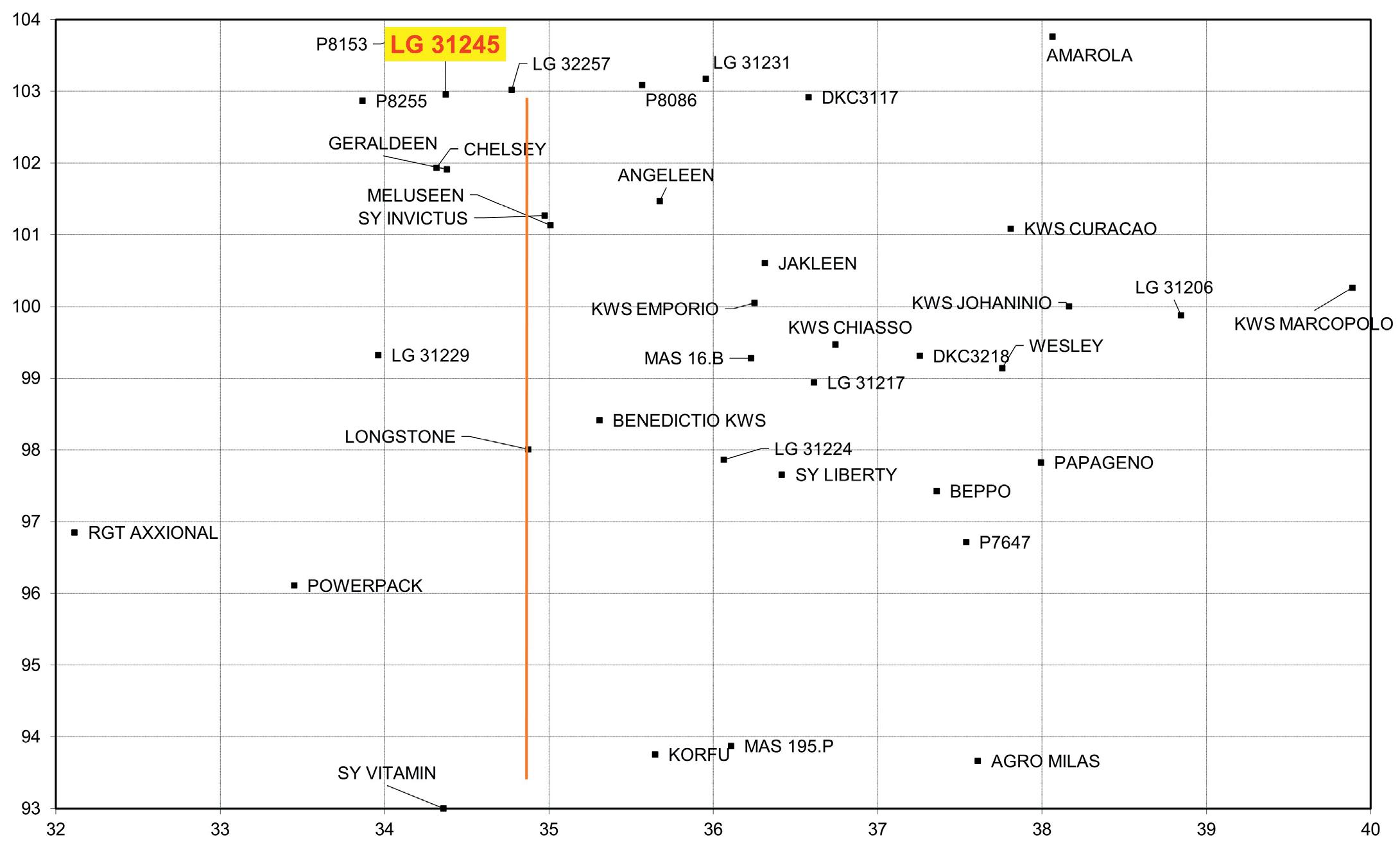 VARMABEL 2023, MAÏS ENSILAGE, VARIÉTÉS TRÈS PRÉCOCES ET PRÉCOCES % MATIÈRE SÈCHE VS. RENDEMENT MATIÈRE SÈCHE/HA (REL. 4 TÉMOINS) – 8 LIEUX