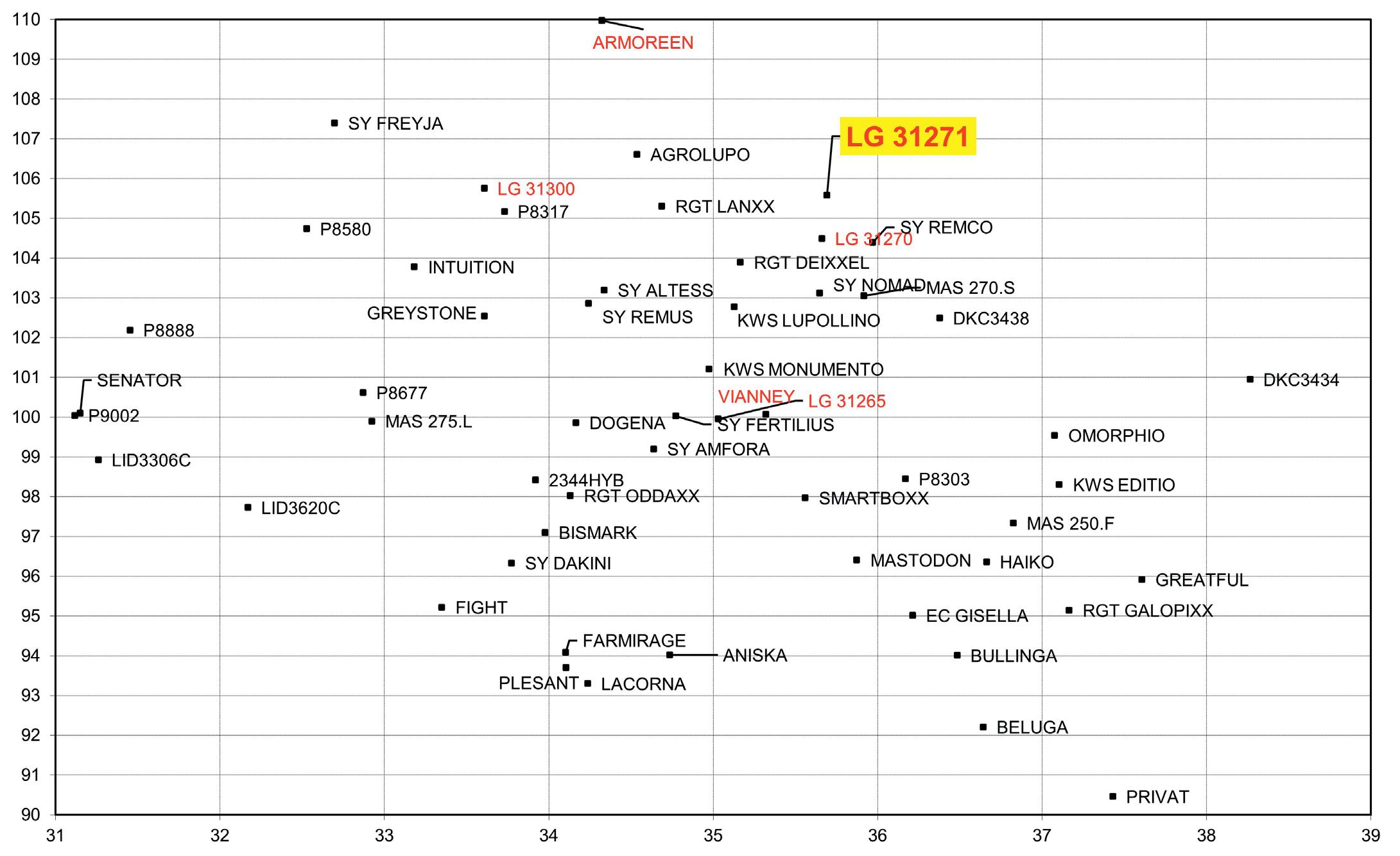 VARMAIS RESULTATEN POST-INSCHRIJVING 2024, S1 - VROEG, ALLE ZONES % DROGE STOF VS. DROGESTOFOPBRENGST (T/HA)