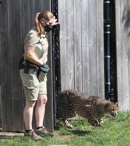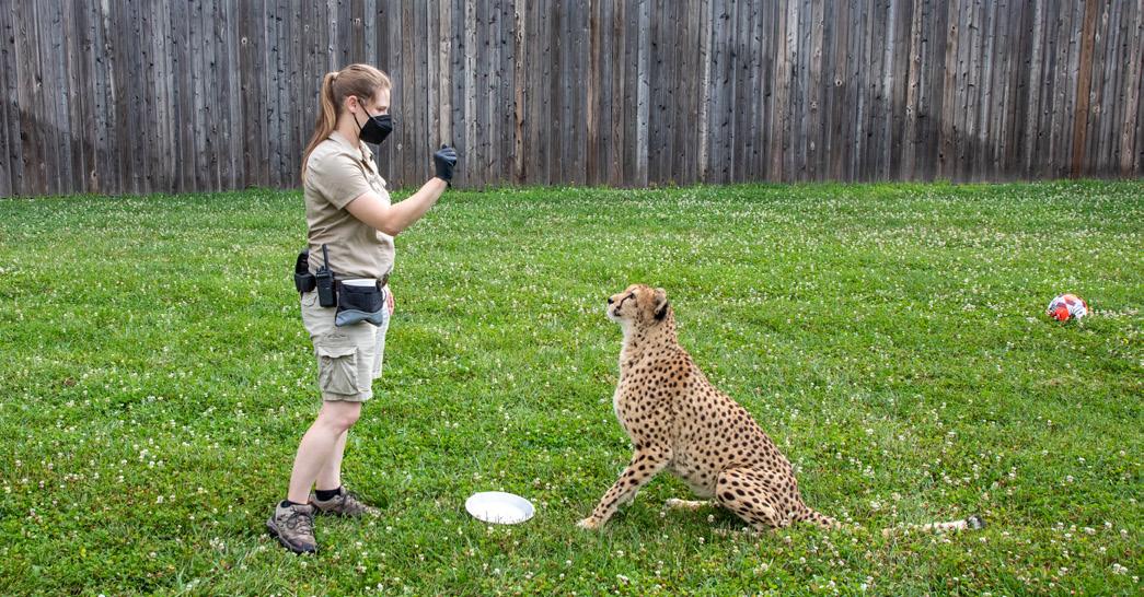 Pictured left: Zookeeper Tori Reynolds participates in a training session with Bella the cheetah.