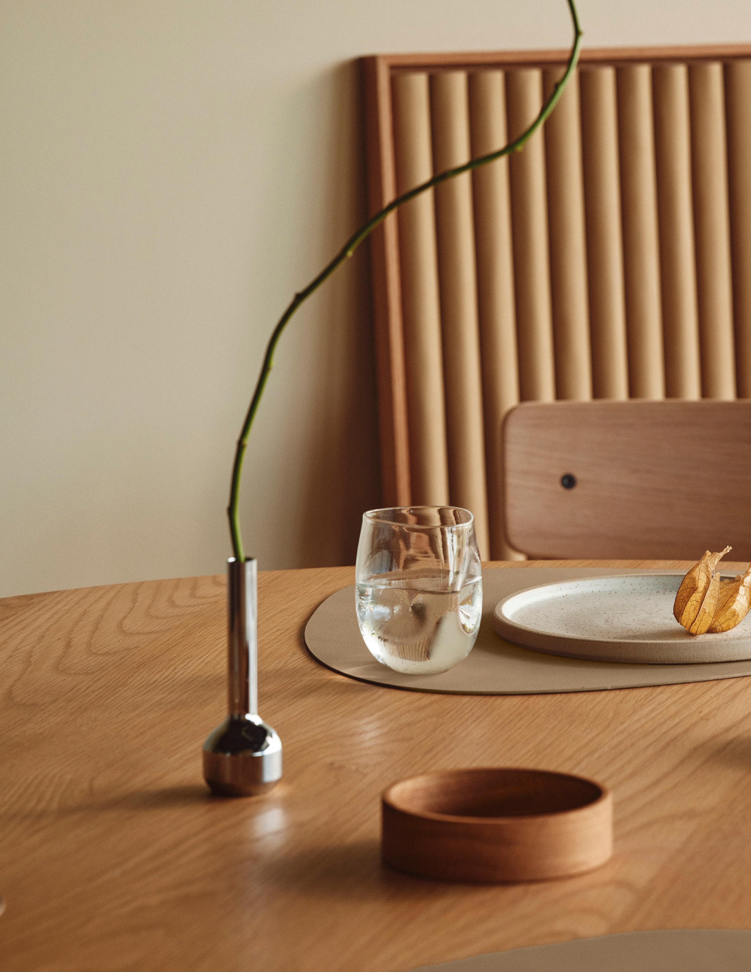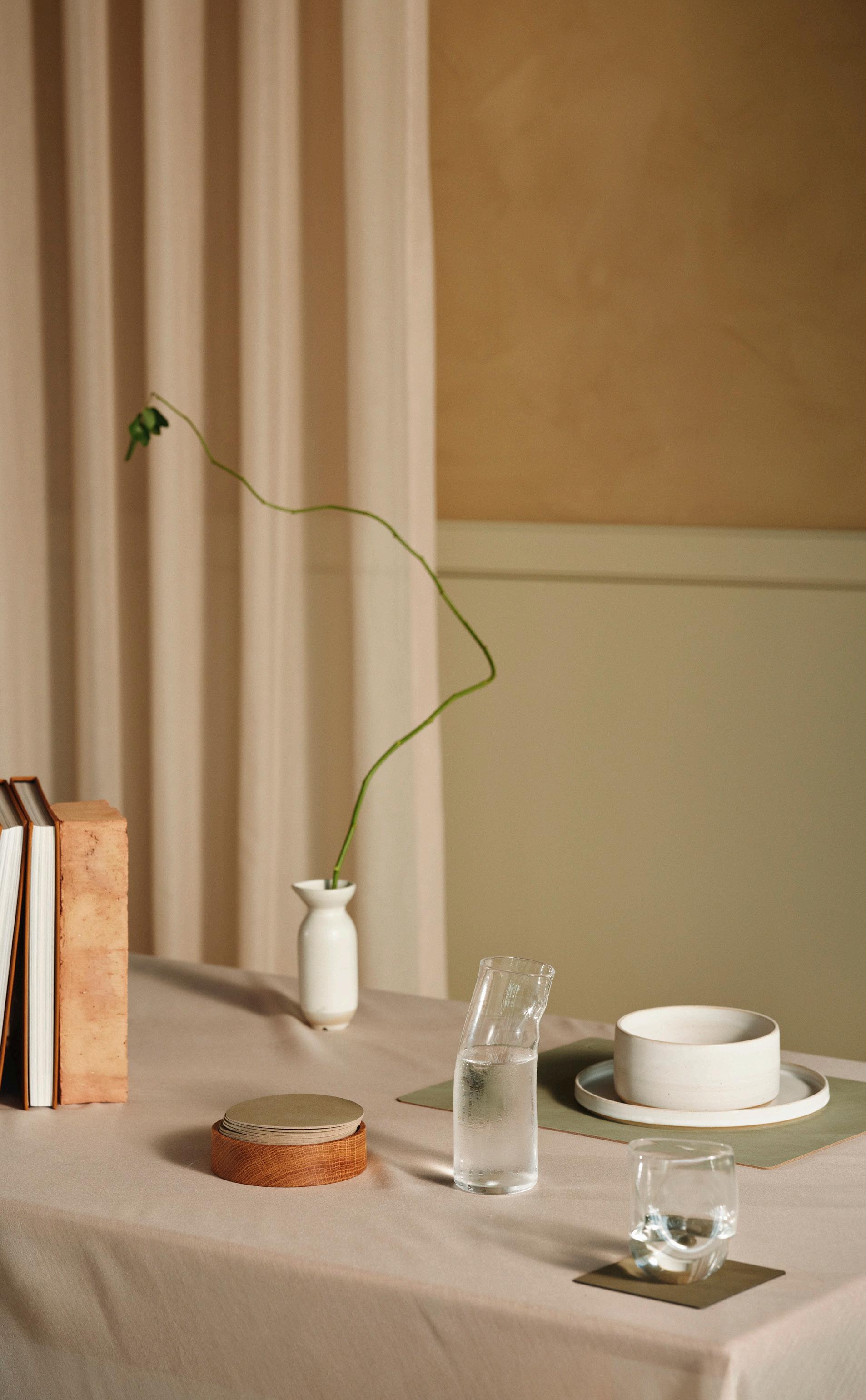 Essential elements designed and crafted with the same care as our mats. Our collection includes, among other items, vases, candle holders, ceramics, and trays — each made to fulfill the tabletop presentation.