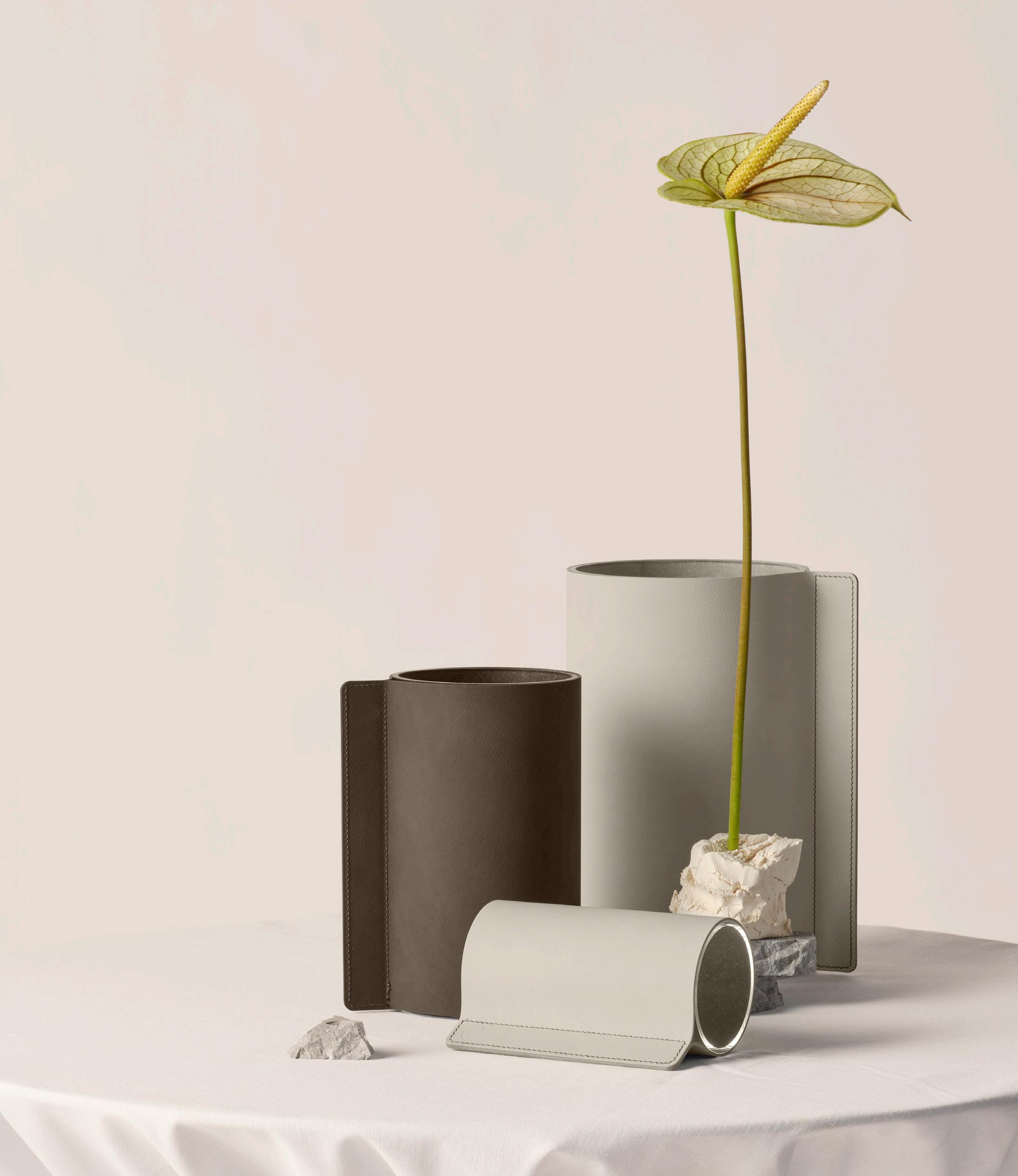 The Block Vase is our take on a classic vase, distinguished by its unique character given by recycled leather and hand-sewn details. The Block Vase is just one of several vase designs in our range.