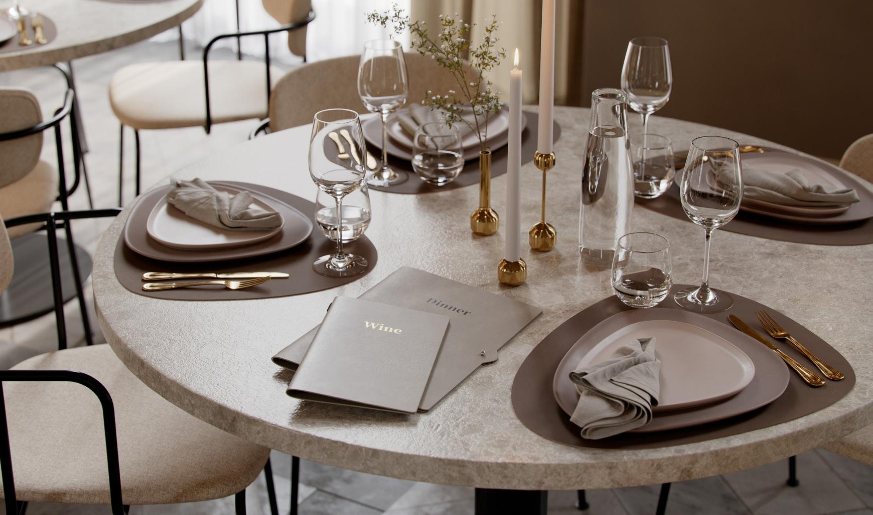 Our large collection for professionals in hospitality and projects includes everything from menu and payment folders, glass and table mats, to trays with unique designs tailored to specific needs. What ties it all together is that the standard assortment can be infinitely varied with customized solutions in logo embossing, sizes, colours, expressions, and functions, that allows
