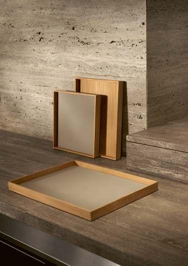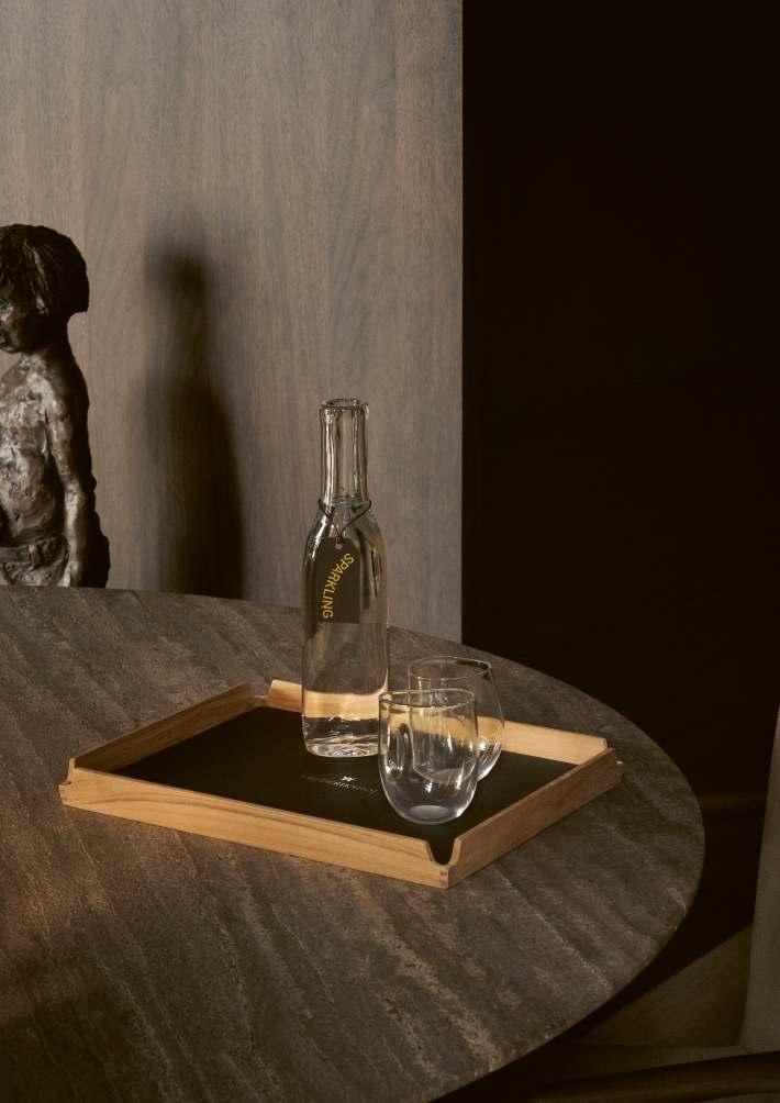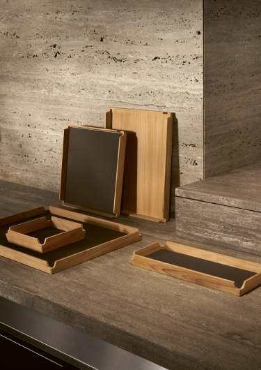 Alu Trays feature a sleek aluminum frame that o ers a modern and re"ned look. ey are cra ed in Denmark and can be supplied either with or without recycled leather inlay. Discreet pads underneath protect surfaces from scratches.