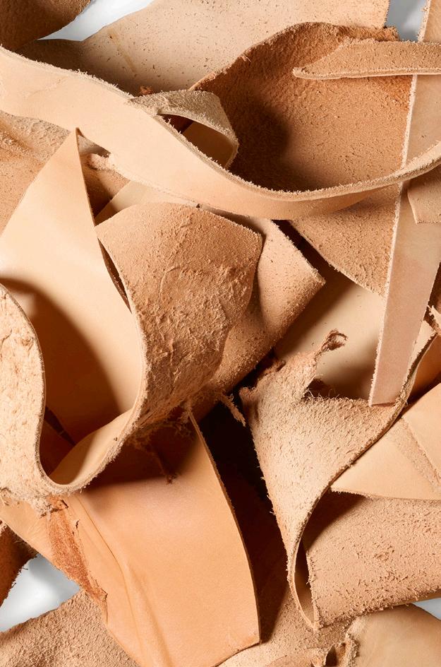 The recycled leather, we use in our designs, originates from vegetable-tanned core leather sourced from surplus production in the furniture and fashion industry — such as leftover pieces of leather from the production of a sofa or shoe soles. The fact that the leather used is vegetable-tanned means, that only plant-based liquids have been used in the tanning process, which is a more sustainable method, that also enables the recycling of the leather.