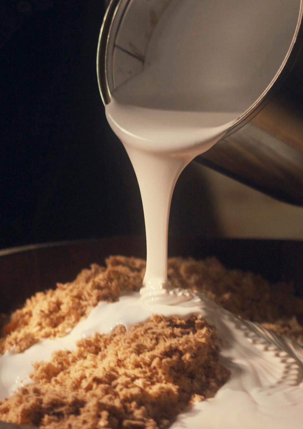 The vegetable-tanned core leather is granulated into tiny pieces, transforming it from a solid piece of leather into crumbs that feel soft and lightweight to the touch. This granulate is mixed with natural rubber from trees in a ratio of 80% core leather to 20% natural rubber, and then pressed to create recycled leather.