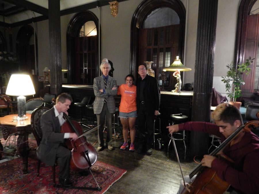 Late Night Testing harmonies on the rented piano in his velvet-draped study