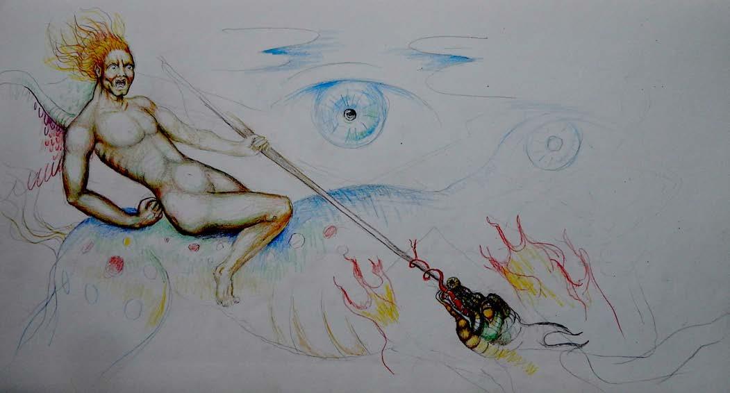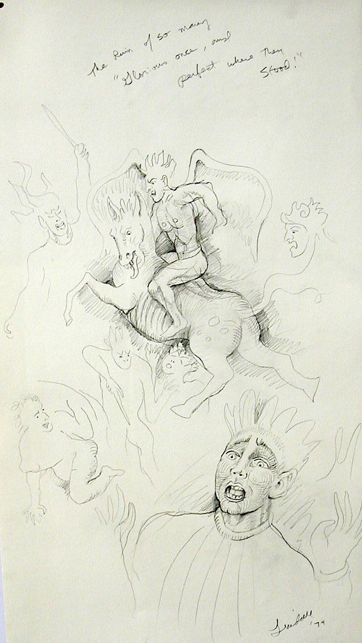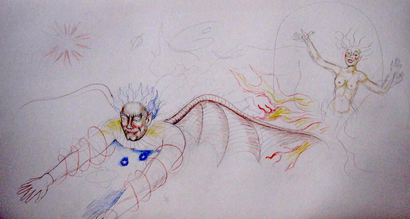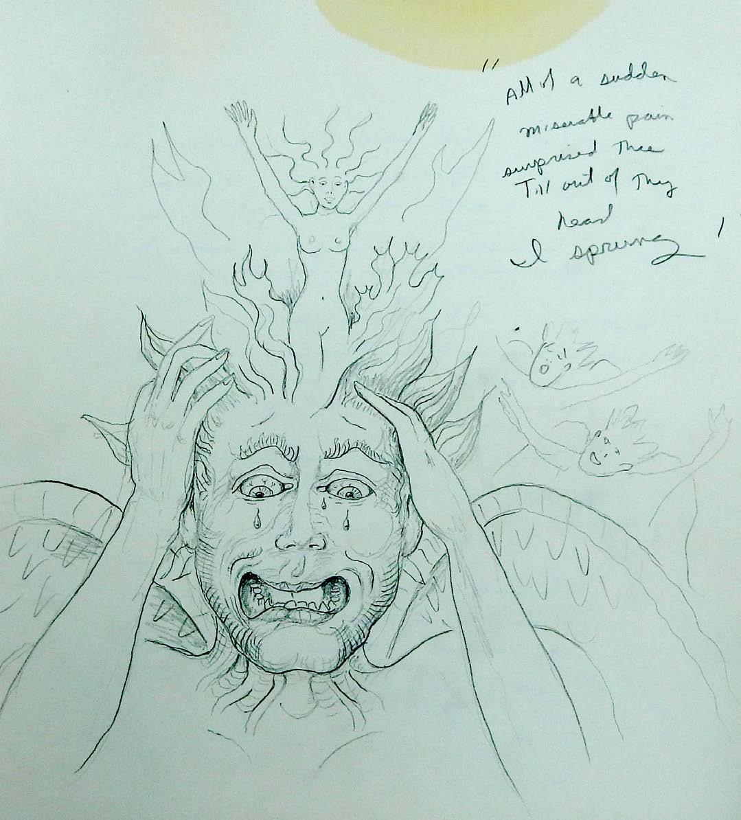 So the scroll is conceptually laid out. The sub-thesis is interesting. Milton conceives of the poem Paradise Lost as a flame from his head, like Athena from the head of Zeus, or Sin from the head of Satan. Note my flying "visionary" foal with a mysterious rider. He will gallop through the scroll revealing Milton's vision.