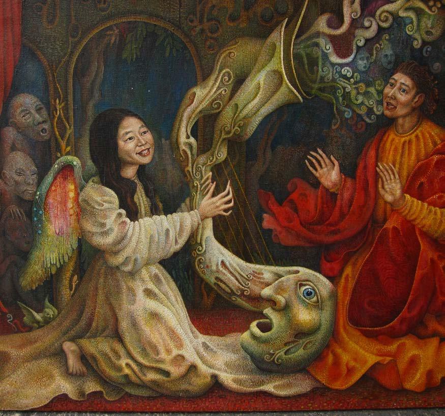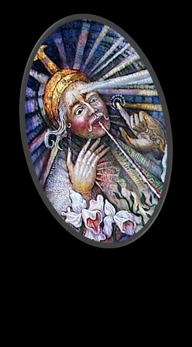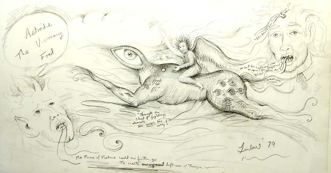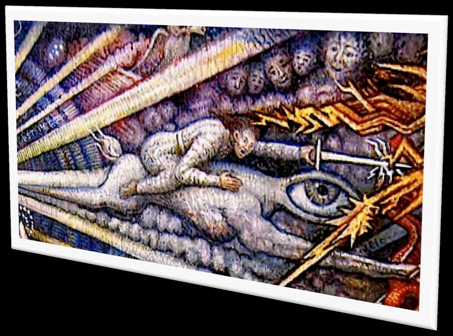 Now the mysterious figure riding the Visionary Foal is revealed. It is none other than Satan, who in the end is forgiven by God in his infinite Mercy. The foal that Satan has been riding, the Visionary Foal, is actually the Vision of God himself. Everything that exists in Heaven, Hell and Earth are ultimately perceptions in the mind of God. God's mind creates all through the permutations of potentiality and actuality (Aristotle) in the mind of God. The Mind of God is all reality and all knowledge. Satan, who erred because he wanted Gods' love for himself above The Son, served God’s purpose in causing the fall of man so God could make actual and demonstrate his Infinite Mercy... by forgiving Man and Satan too. Satan, now having become Lucifer again, rests happily with the Visionary Foal, having been forgiven. Knowledge is vindicated as seen wherein the apex of the Universal Library of the Mind of God, with Dr. Robert Wickenheiser as the Head Librarian, becomes the stairway to and from Heaven bearing the Second Coming of Christ. Notice the eye of the Visionary Foal leads up to the eye representing God's universal all seeing Wisdom.