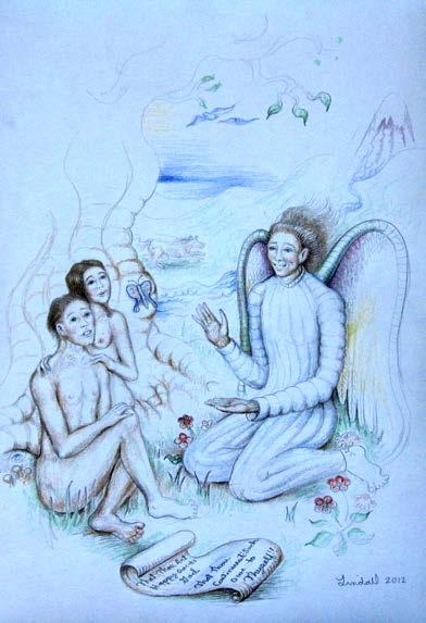 Raphael steps down the eastern climb, A seraph winged into the blissful field. Plumes he shook and with grace so fair, and Heav’nly fragrance filled the air. And som message high they guessed the pair. Eve then Adam hasted hither, she with wondering stare Looking eastward among the trees.