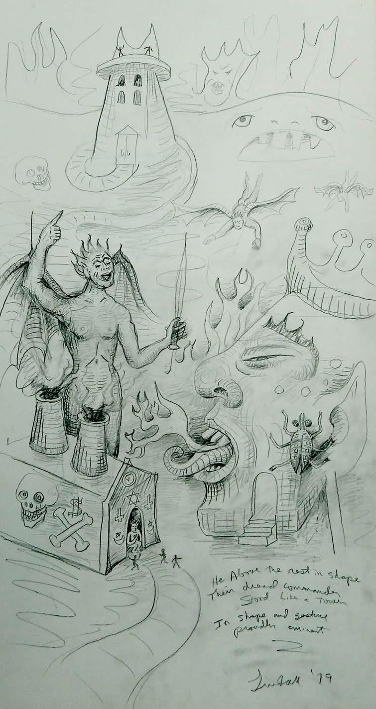 P. Pandemonium. Satan’s Council. Moloch. Belial, Beelzebub persuades. Satan assumes the charge. Death bars the fiend. Sin’s tale. Said mayhem abounds. Now the gates open. Chaos guides Satan.