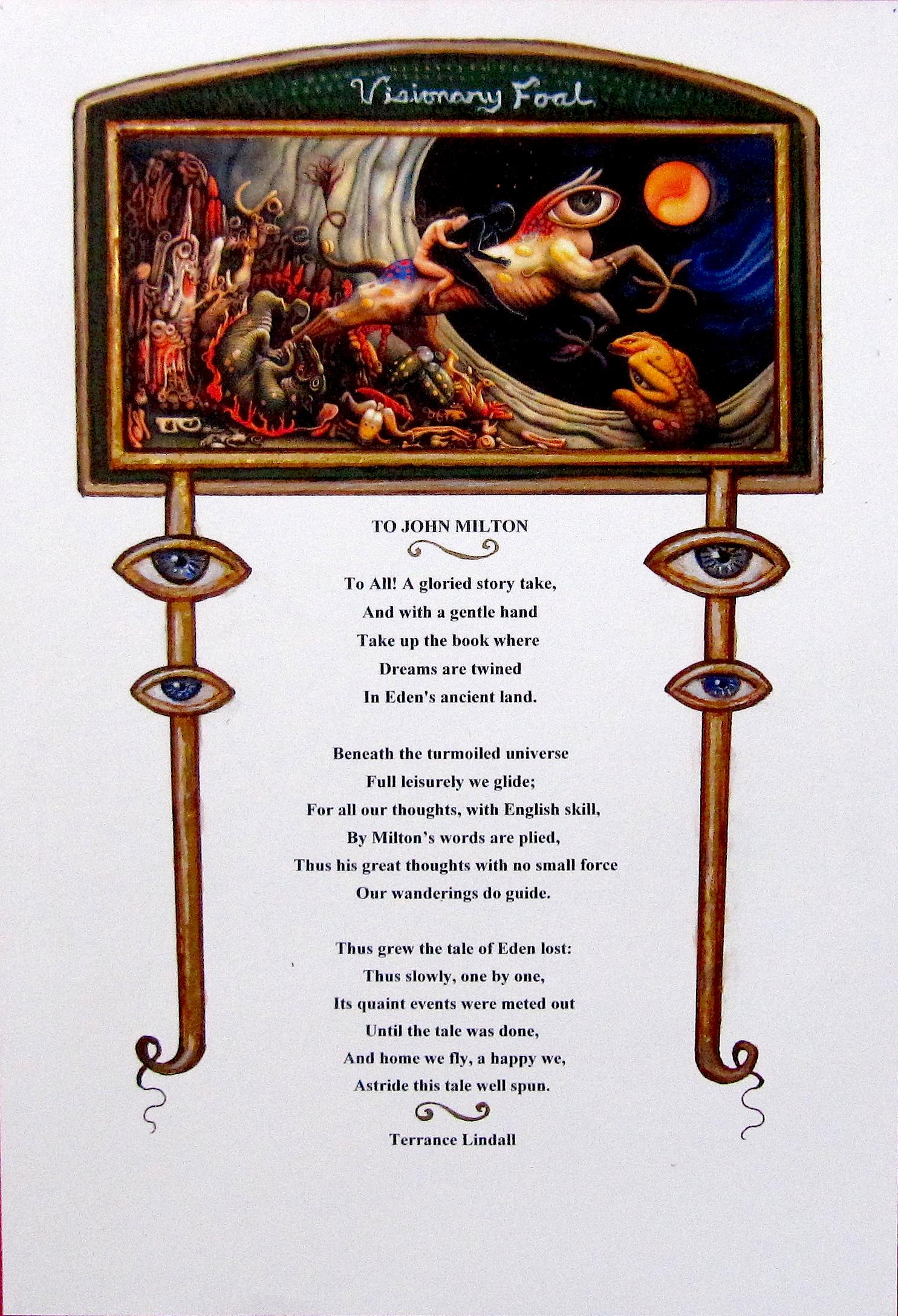 The artist Terrance Lindall came to Milton while pursuing a double major in Western Philosophy and English Literature, graduating Magna Cum Laude from Hunter College New York City. Paradise Lost, this “greatest work in the English language," enraptured Lindall because it encapsulates Lindall’s metaphysical, epistemological and axiological philosophies. Today Terrance Lindall’s paintings for John Milton's Paradise Lost are perhaps the best-known illustrations for this epic outside of those by William Blake and Gustave Dore'. Thus the power of Milton today is reflected in how it continues to inspire artists, writers and intelligent persons at all levels, creating a ripple effect into society.