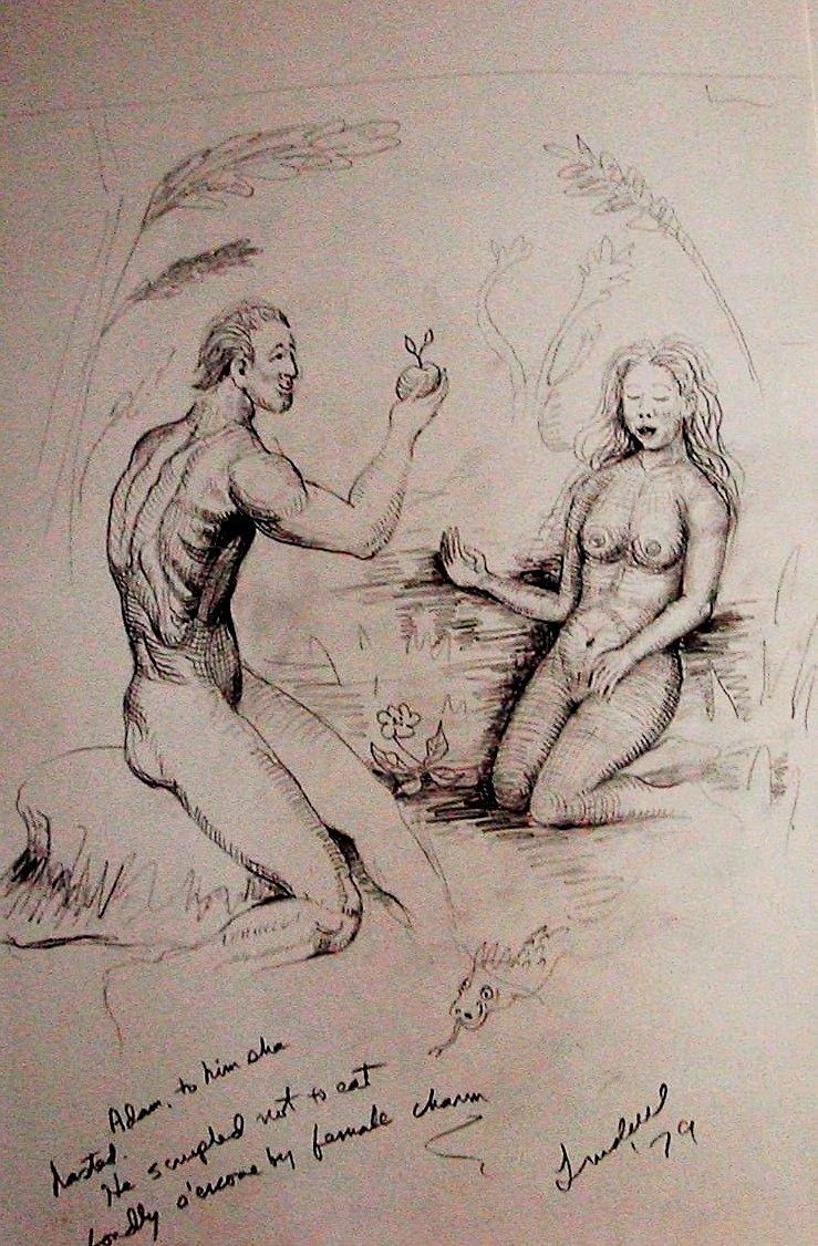 Ev’n Adam replied abashed where thus he stood: “Me this woman whom thou gav’st, for my good, Eve, know that taking from her sweet hand I could Not expect som ill, and yet she gave me of That Dread Tree of Death and I did eat, for she I love.”