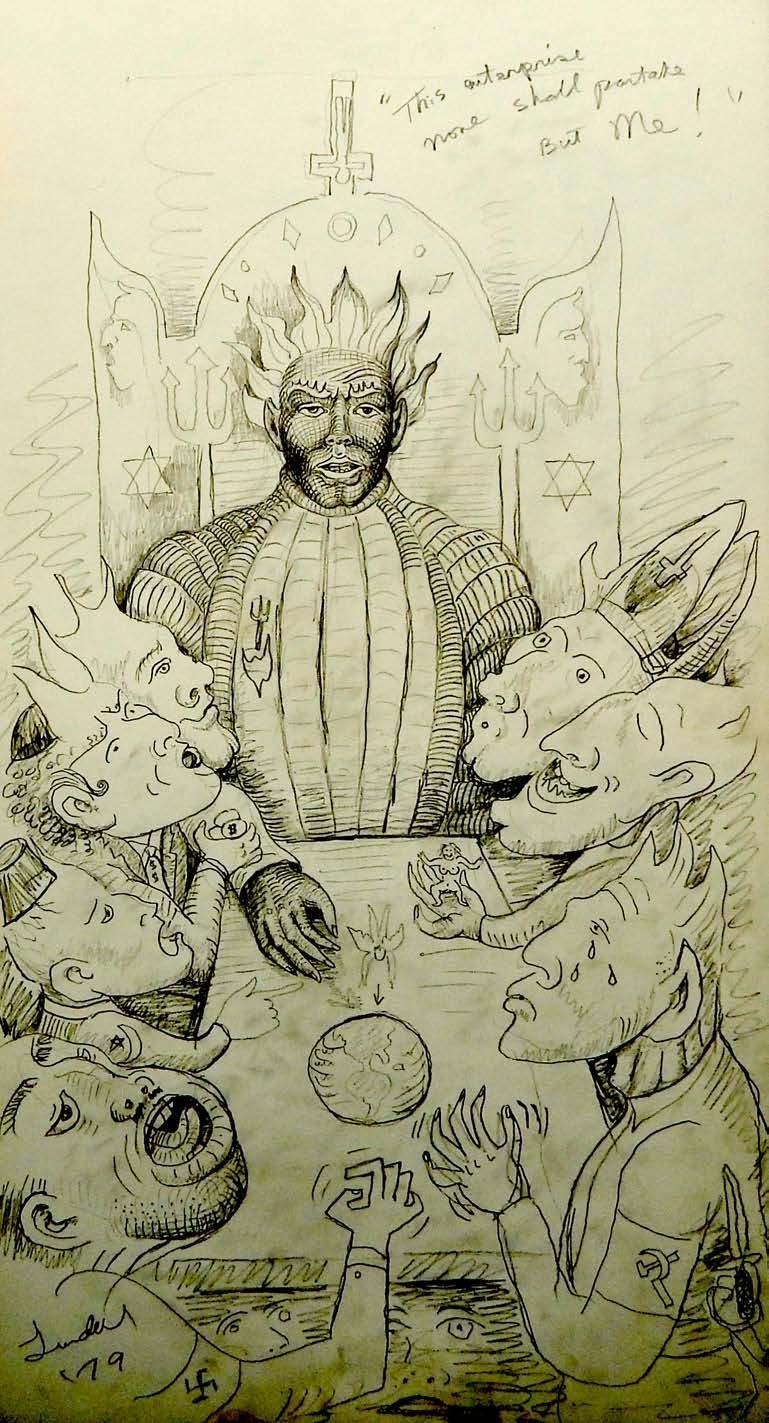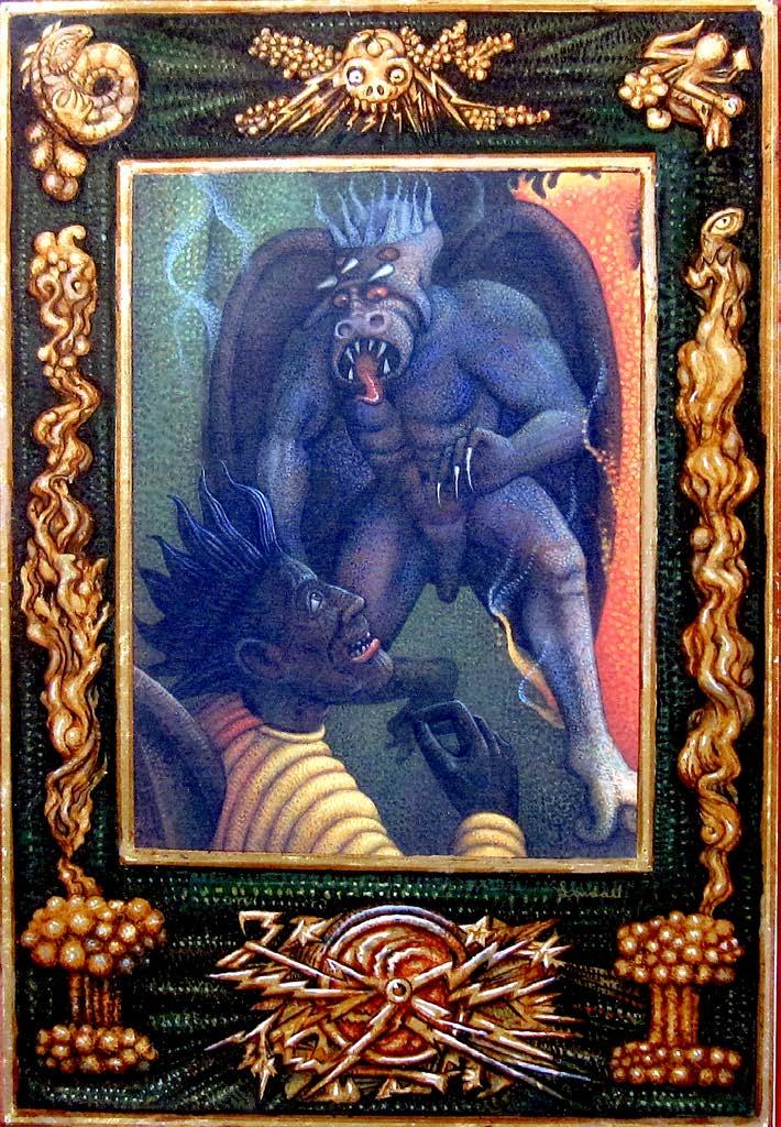 So the visionary horse leaps across the Bodleian Library representing man's accumulation of knowledge. Notice the "solemn council" in Pandemonium. Figures from the major Western religions are represented as well as two famous world leaders. Here on Earth our leaders all proclaim to be doing good for their people...by persecuting and murdering their enemies mostly. That's the nature of humanism, as I argued recently on The Milton lists. No matter how we try to do good for humanity, it is twisted by the will of Satan through our spiritual and temporal leaders. Notice Nemo's submarine Nautilus at the bottom. He symbolizes that predicament: he opposes an evil regime by sinking ships with sailors who are just doing their duty. He does evil thinking he is doing good.