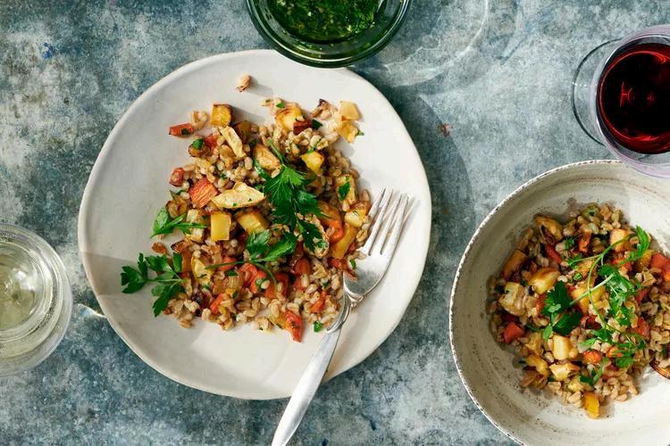 1 While farro cooks, toss together carrots, parsnips, onion, celery root, 1/4 cup oil, and 2 teaspoons salt on a rimmed baking sheet; spread in an even layer. Roast in preheated oven until vegetables are tender and lightly browned, 25 to 30 minutes