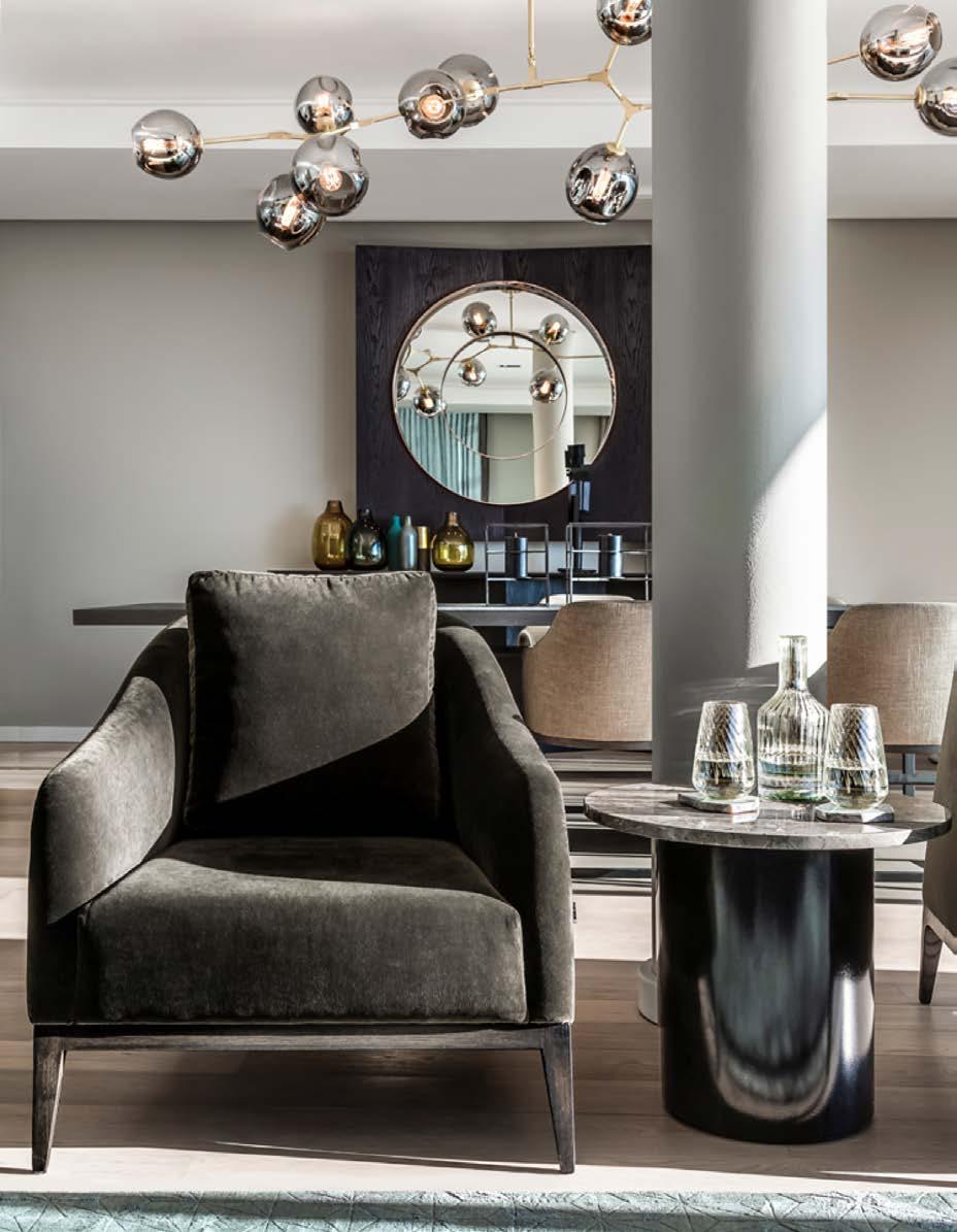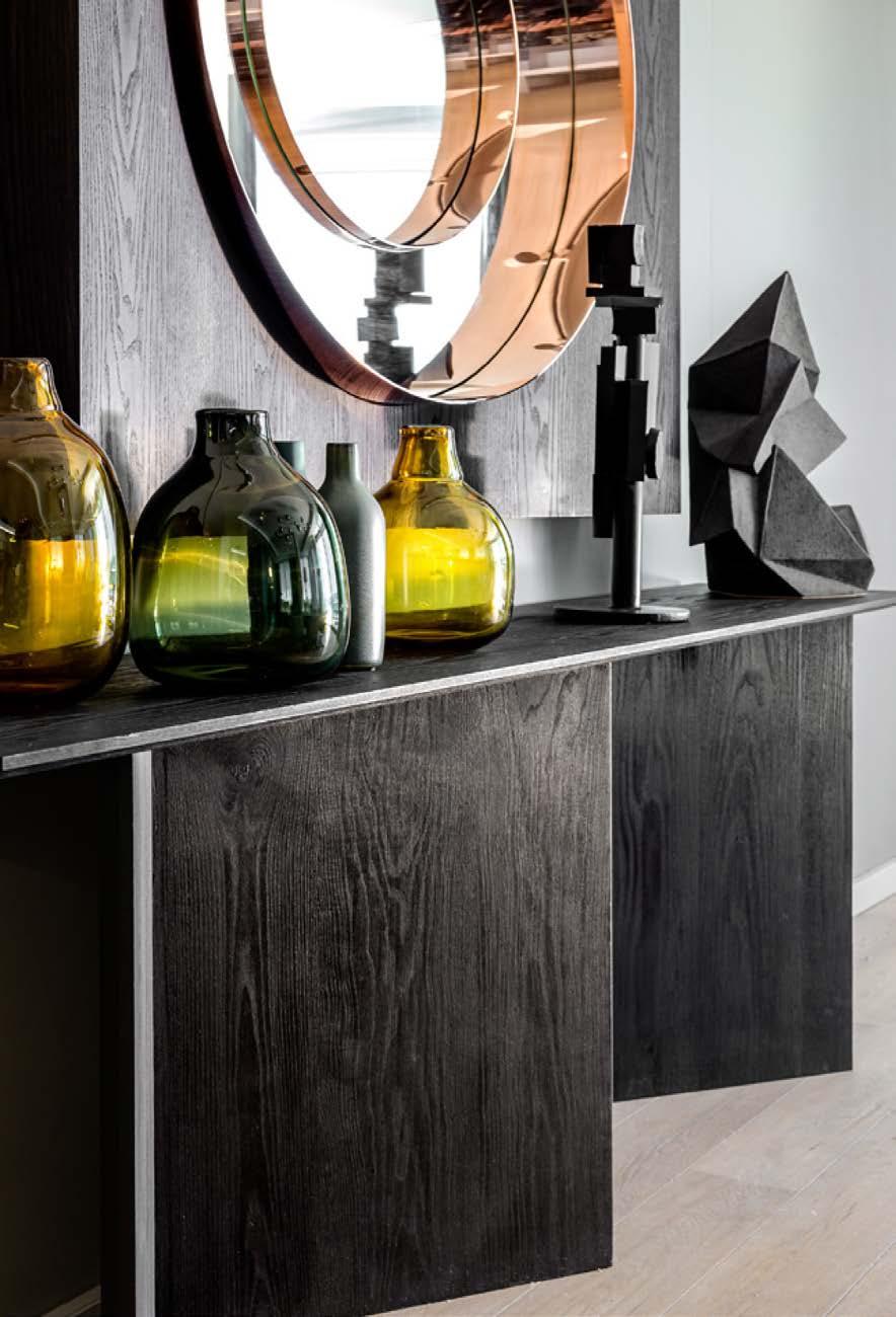 Los tableros de mesa de mármol Dream Emperor y Absolute Black Granite se combinan con bases de acero en, mesitas de café y balcón. La mesa de comedor, los taburetes y el servidor están tallados en madera de fresno cepillada con alambre teñido de carbono, que también se utiliza en el marco del espejo “Port” de la firma OKHA, que, con su espejo empotrado con marco de cobre, tiene un tono náutico de las ventanas circulares de un barco.