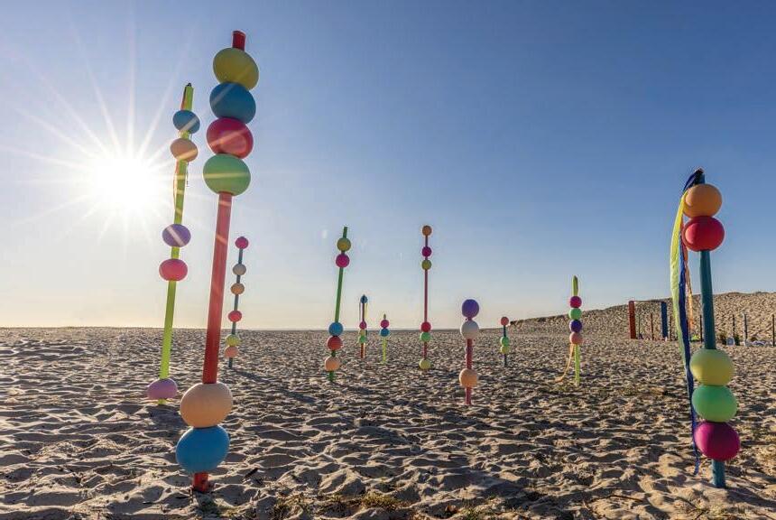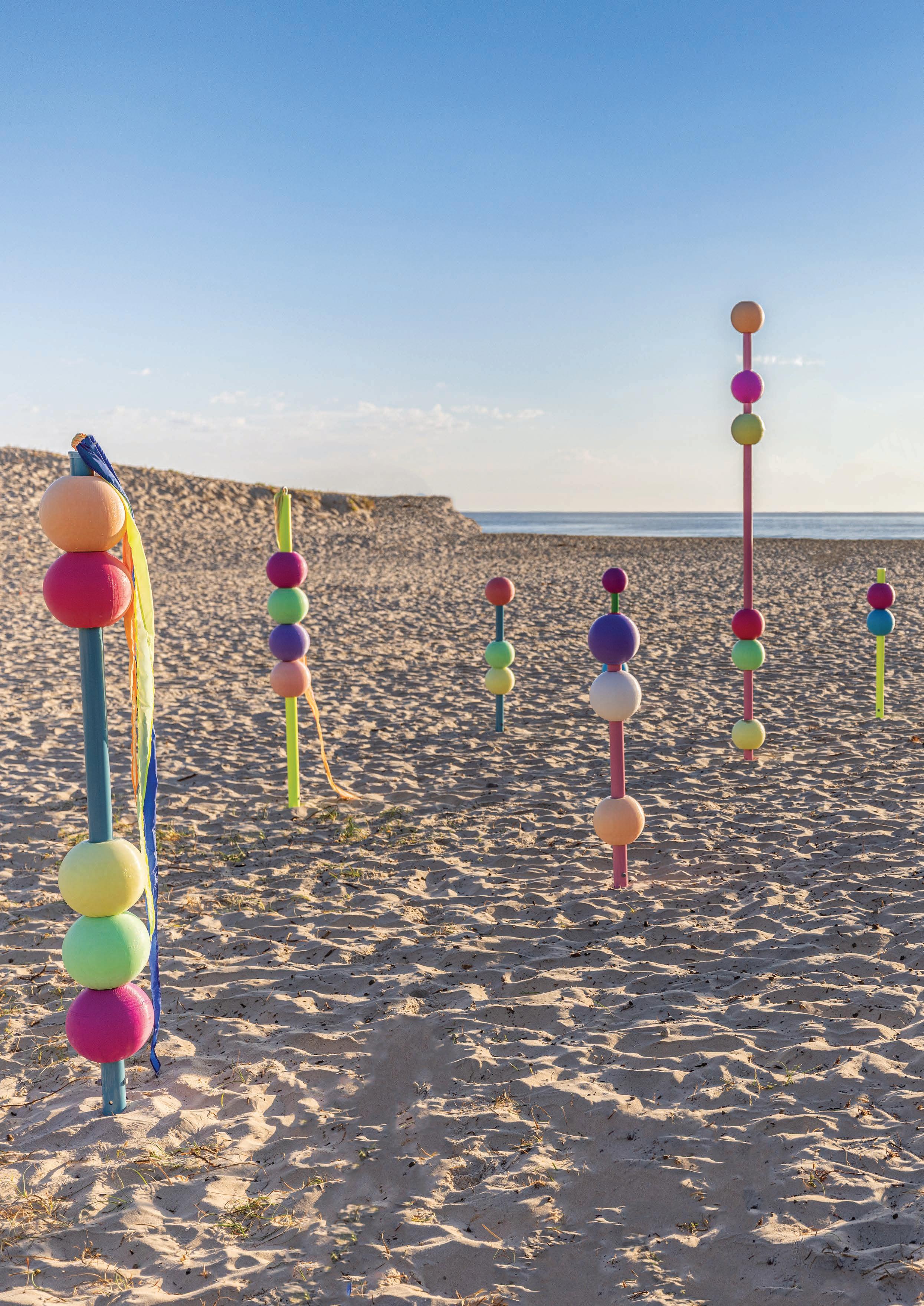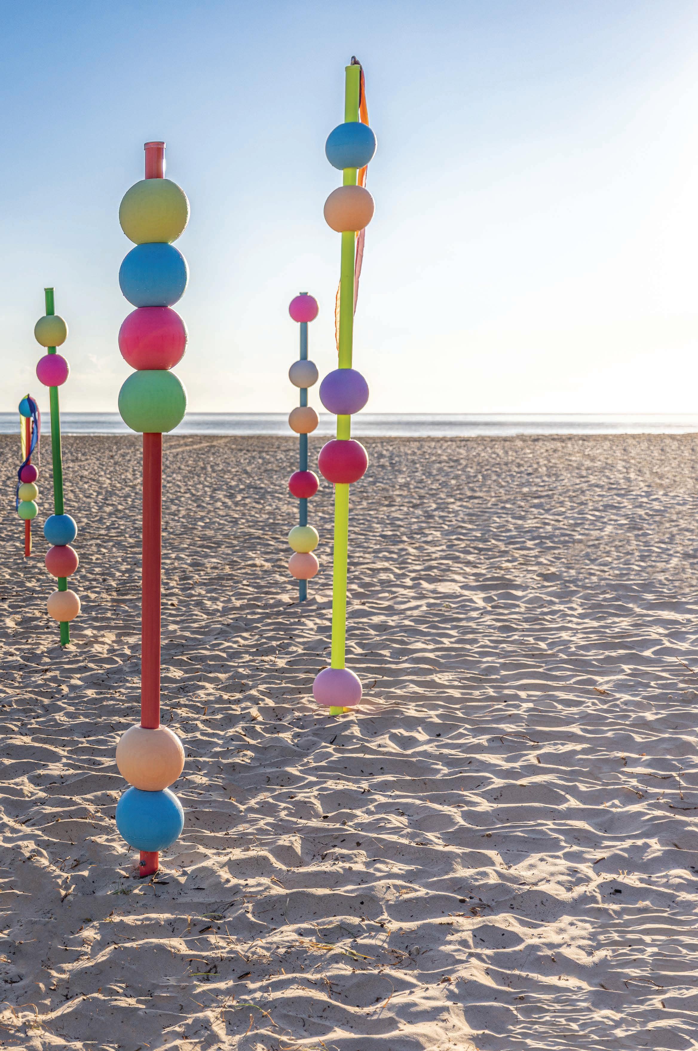 Our installation, Child’s Play, celebrated the imagination and wonder that creativity brings to childhood and to our Creative Industries classrooms. The sculpture consisted of brightly coloured poles topped with 3D-printed beads of varying sizes and hues, arranged across the sand in an immersive, playful formation. The poles stood at differing heights, creating a rhythmic landscape that invited visitors, especially children, to explore, interact, and weave their way through the artwork. More than a playful display, the piece symbolised resilience, curiosity, and the unity of our creative community.