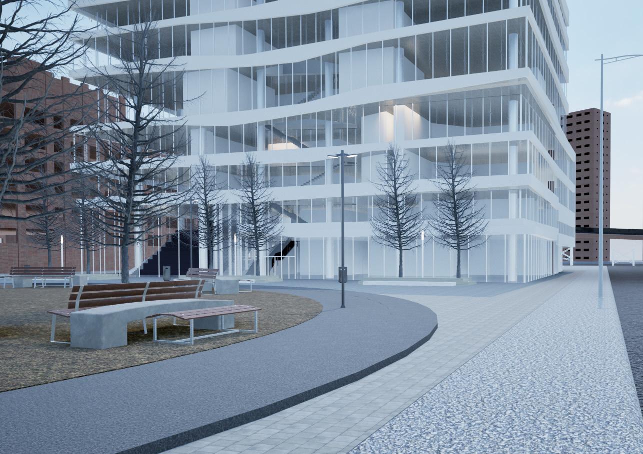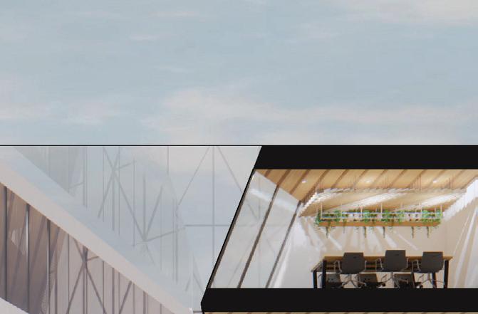 The transparency of the building physically through glass and conceptually through openness exposes structural, environmental, and spatial systems as teachable elements. The split through the building becomes a daily site of exploration, offering views, light, and movement that constantly shift. Public engagement spaces, including the lifted volume and social stair, turn the school into a living exhibit of landscape architecture. The architecture challenges students to question boundaries and relationships between nature, city, and design, making the building itself a landscape of discovery.