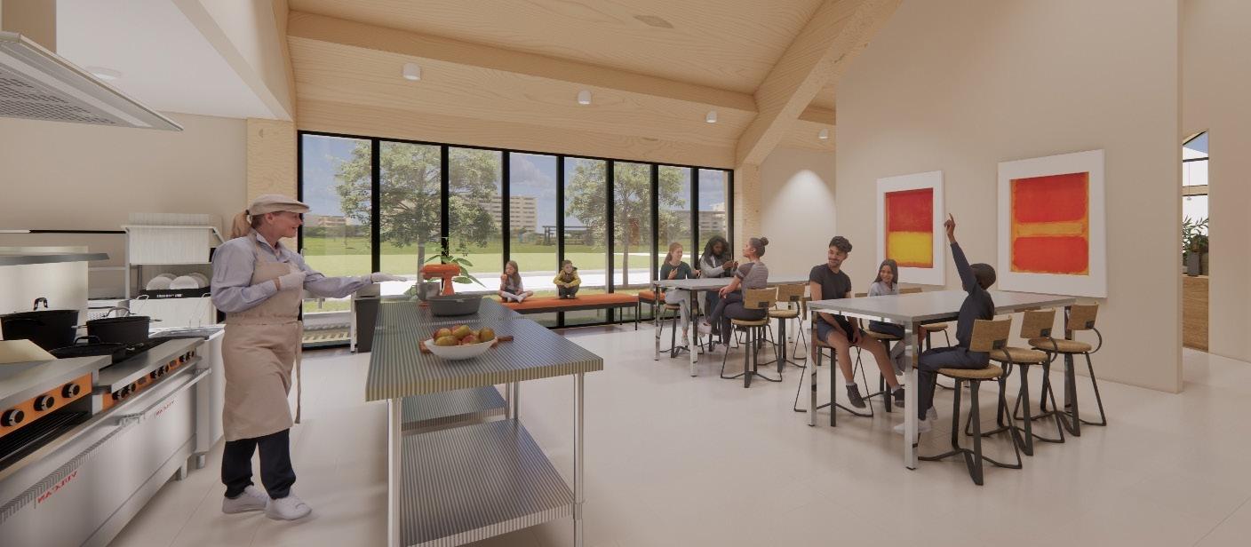 Natural light, access to views, and materials that support sensory comfort define the building’s focus on well-being. The split carves a visual and physical connection to the park, allowing green space to flow through the core of the building. Interior finishes like acoustic wood reduce noise in learning spaces. The open floor plan enhances movement and social interaction, while the social staircase provides a space for gathering, pausing, and connecting. Transparency and daylight foster a sense of openness and orientation, nurturing mental, physical, and social health for students and staff.