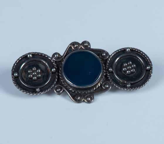 Sterling silver domed flower like setting with a carnelian color cabochon stone. Backstamp Sterling BA. Modern sterling silver triangle with black onyx stone set high with a scalloped edge. Round: 0.84”dia. Triangle: 1”dia.