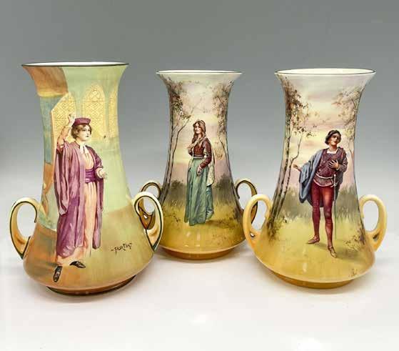 Double handled vases designed with characters from Shakespeare plays including Portia, Juliet and Romeo. Glossy finish over multi colors. Royal Doulton backstamp.
