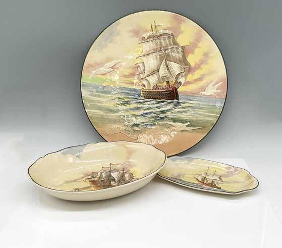 Lovely see scenes with famous sailing vessels including HMS Victory on wall plate, An East Indiaman tray and Henry Grace A Dieu serving bowl. Royal Doulton backstamp.