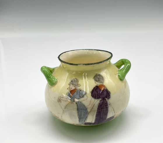 Hand painted double handled round vase, Dutch women in town, colored in pale yellow with lime green accents. Royal Doulton backstamp.