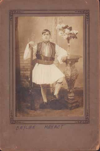 Pair of antique albumen Cabinet photographs on board from New Orleans, Louisiana that feature two young males, Hasbe Hassan and Daylian Mahmot, dressed in typical Greek uniforms and holding guns. Mount boards include embossing on lower center: Fios Studio, 1310 Olive Street, New Orleans. Each albumen print dimensions including board: 6”L x 9”H.