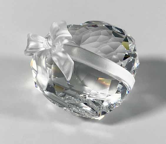 Part of the Fables and Tales theme group. Figural is made from clear crystal and designed with represented handles and front lock. Swarovski backstamp. 9100 000 014. This item has its original box. 4.25”L x 4.25”W x 2.25”H.
