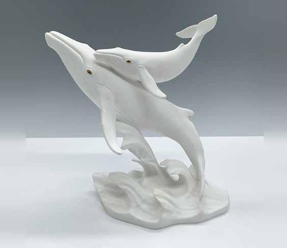Depicts a majestic scene of a whale and its calf, featuring gold eyes and a white matte finish. Lenox backstamp.