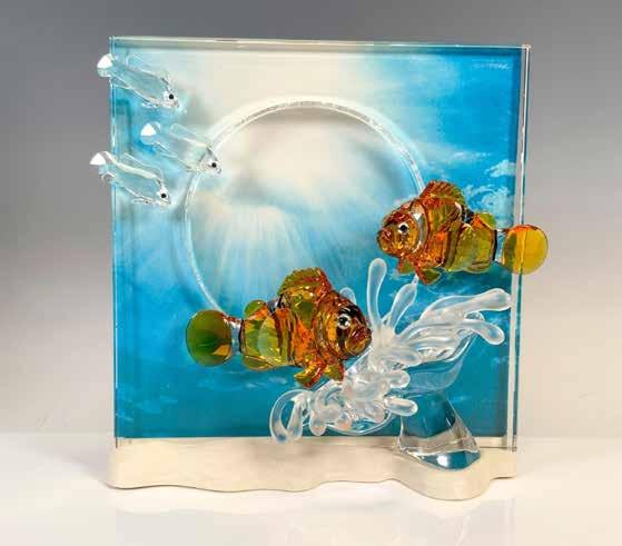 This stunning set made of silver crystal, features a locomotive cabin and four carriages, complete with hooks for connecting them. It also includes a round mirror adorned with painted train tracks. Swarovski etched backstamp. Includes the certificate and the original box, Dimensions: 2.75’’H x 4’’W. Mirror base Dimensions: 3.25’’dia. Cabins: 1’’L x 0.5’’W x 1075’’H, Each.